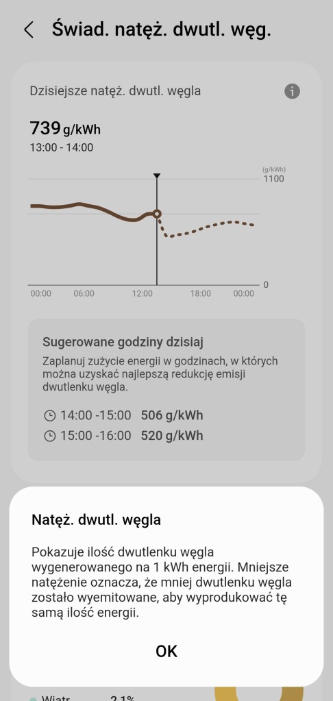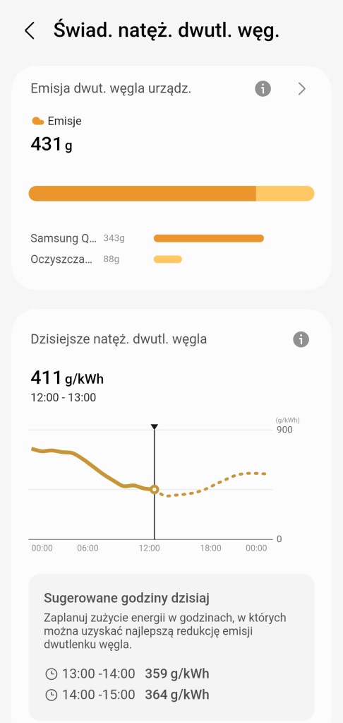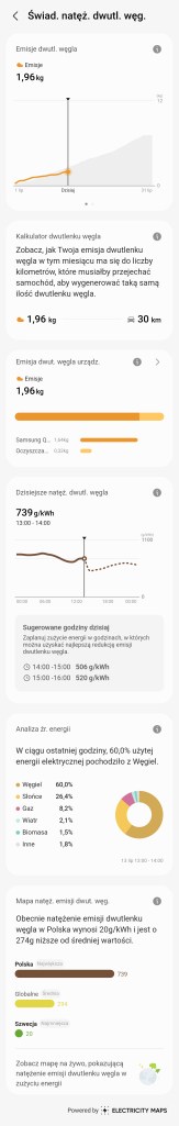 Dzięki tej aktualizacji użytkownicy SmartThings Energy mogą teraz uzyskać wgląd w źródła i pochodzenie swojej energii w aplikacji SmartThings. Dzięki partnerstwu z Electricity Maps usługą wizualizującą źródła energii elektrycznej i związaną z nią emisję dwutlenku węgla, użytkownicy mogą podejmować bardziej świadome decyzje dotyczące zużycia energii i zmniejszać swój ślad węglowy. Poniżej screeny z wykresami prezentowanymi w aplikacji mobilnej SmartThings.