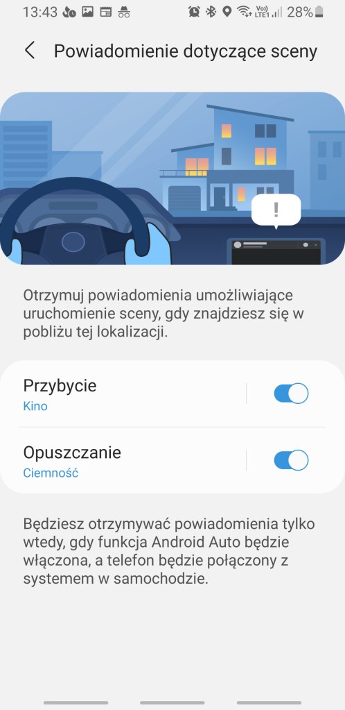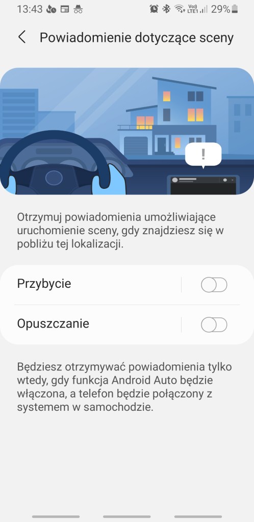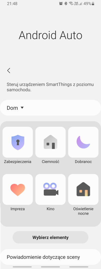 Dodatkowo mamy opcję wyboru powiadomień, które będą umożliwiać włączanie sceny z samochodu, kiedy wracasz do domu lub opuszczasz dom. Możemy wybrać tylko jedną taką scenę dla obu możliwości. Aby to zrobić, wybierz sceny do uruchomienia, przechodząc do lewego menu >> Ustawienia >> Android Auto >> Powiadomienie dotyczące sceny.