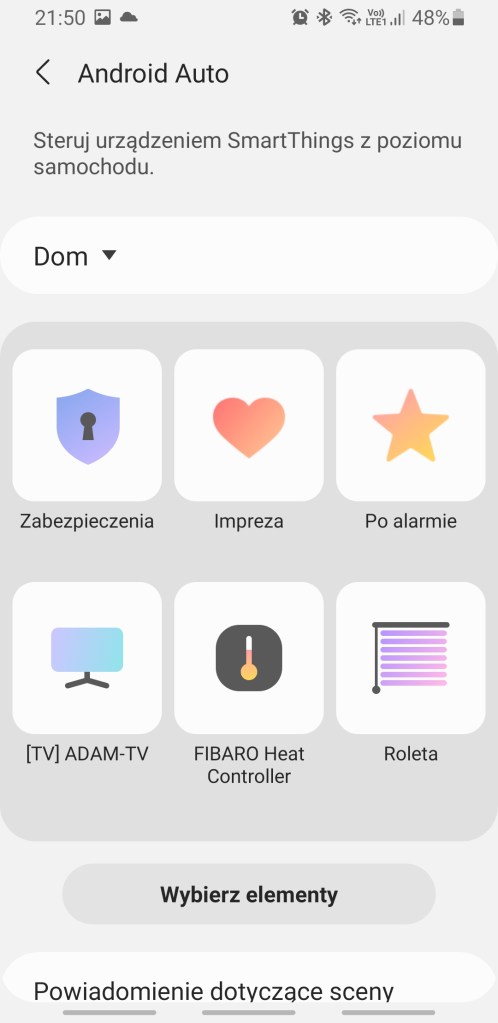 Na panelu nawigacyjnym możemy umieścić maksymalnie 6 urządzeń, scen lub usług, które będą pokazywane w systemie samochodowym. W tym celu należy przejść do lewego menu w aplikacji SmartThings >> Ustawienia >> Android Auto. Klikamy „Wybierz elementy”, wybieramy z pośród wszystkich SmartApp, scen i urządzeń, maksymalnie 6 elementów. Wybór zatwierdzamy, klikając „Gotowe” na dole ekranu.