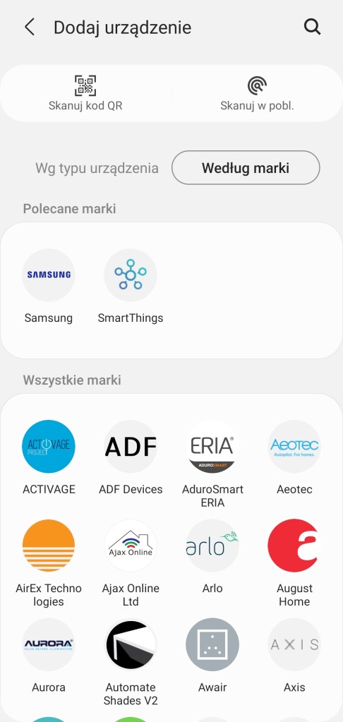 [UWAGA]: Urządzenie do działania na platformie SmartThings wymagło zainstalowania niestandardowych programów obsługi. Funkcja ta została jednak wycofana. Na chwilę obecną nie jest możliwe skonfigurowanie urządzenia poniższą metodą w aplikacji SmartThings.