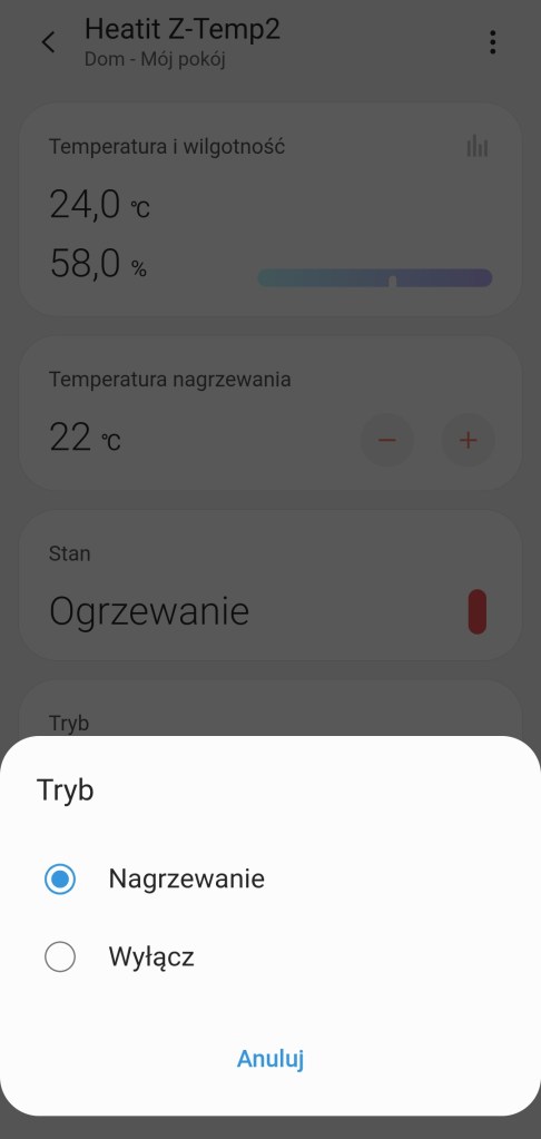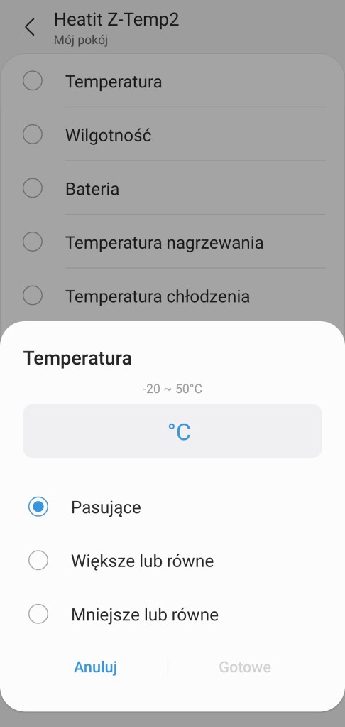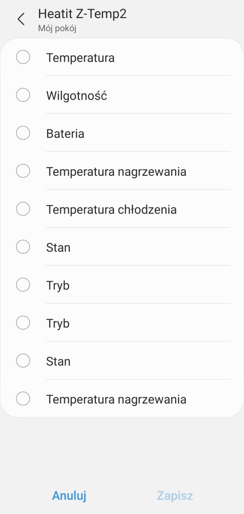 Tworzenie automatyzacji „Jeśli … to Wtedy” musimy podzielić na dwa etapy, ponieważ znacznie różnią się dostępne opcje jeśli inicjujemy warunek „Jeśli”. W pierwszej możliwości urządzenie pozwala na wybranie opcji „Temperatura” czyli powiadomienia o temperaturze z zakresu -20 – 50°C, w tym czy są większa/mniejsza niż odczytana. Kolejna jest wilgotność, tutaj mamy zakres 0 – 100 %, w tym czy są większa/mniejsza niż odczytana. Informacja o poziomie baterii z zakresu 0 – 100% w tym czy jest większa/mniejsza. Temperatura nagrzewania i chłodzenia, w zakresie 0 – 40°C. Odczyt stan aktualnej pracy, tutaj dostępne opcje to: chłodzenie, tylko wentylator, ogrzewanie, bezczynność, oczekiwanie na chłodzenie/ogrzanie oraz ekonomizer wentylacji. Kolejny to stan pracy: „Nagrzewanie” (włączony termostat) oraz „Wyłącz” (praca wstrzymana). Na zdjęciu z listą opcji można zauważyć powielenie funkcji: temperatura nagrzewania, tryb i stan. Zapewne jest to chwilowy błąd w niestandardowym kodzie obsługi.