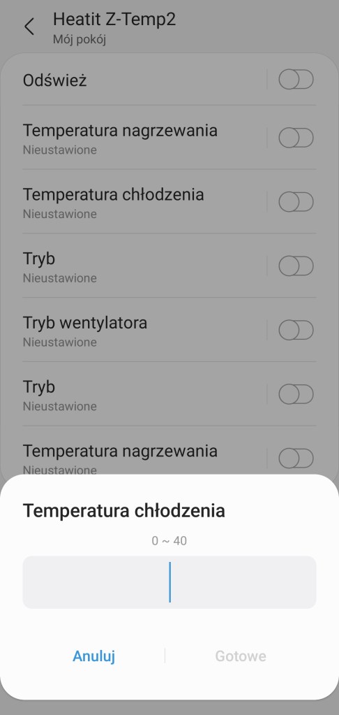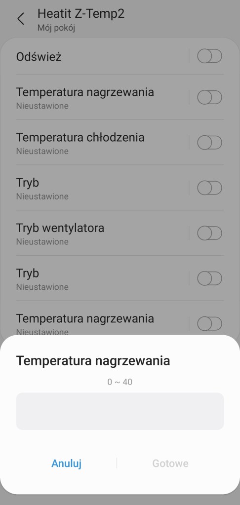 W drugiej możliwości „Wtedy”, mamy mniej możliwości, możemy odświeżyć stan parametrów termostatu, ustawić temperaturę nagrzewania/chłodzenia w domu, w zakresie 0 – 40°C. Zmianę trybu pracy termostatu: nagrzewanie bądź wyłącz. Ustawić tryb pracy wentylatora, dostępny jest tylko automatyczny. Ostatnią opcją jest możliwość dowolnego opóźnienia tych czynności o zadaną jednostkę czasu. Tutaj również mamy do czynienia z powieleniem funkcji temperatura nagrzewania oraz tryb.