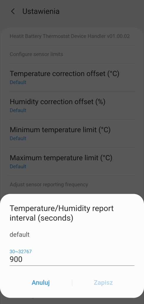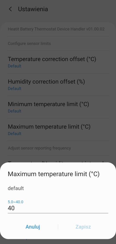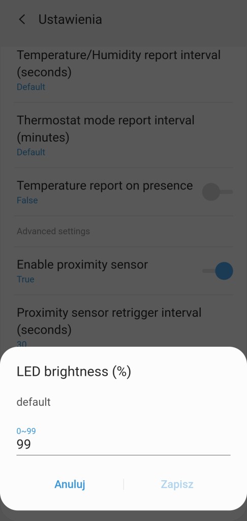 W głównym panelu aplikacji mamy informację o odczytanej temperaturze i wilgotności, możliwość nastawienia temperatury nagrzewania, ze skokiem 1°C. Aktualizując „Stan”, termostat informuje czy jest bezczynny czy ogrzewa dom. Mamy informację i możliwość zmiany trybu pracy głowicy: nagrzewanie bądź wyłączone – tutaj włączamy lub wyłączamy ogrzewanie domu. Procentową informacje o poziomie baterii. Na ostatniej belce posiadamy możliwość zablokowania panelu termostatu, aby nikt niepowołany nie zamienił temperatury w domu. Panel „Historii” nie różni się znacznie od innych urządzeń, mamy dostęp do sortowania i przestudiowania historii działań urządzenia z ostatnich 7 dni. W ustawieniach „Edytuj” mamy standardową możliwość zmiany nazwy, lokalizacji oraz pokoju. Dodatkowo mamy zaawansowane ustawienia, możliwość między innymi: korekty pomiarów temperatury i wilgotności, maksymalny limit temperatury, interwały raportów, tolerancję histerezy ogrzewania, czyli opóźnienie na reakcję zmiany temperatury, interwał ponownego wyzwalania czujnika zbliżeniowego oraz ustawienia dotyczące ekranu LED, takie jak jasność czy czas świecenia panelu LED po wykryciu ruchu. Poniżej screeny z zakresami wartości.
