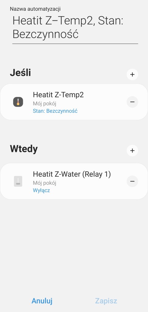 Jak zaleca producent, pełnię możliwości i sterownia termostat pokazuje z dedykowanym regulatorem sterowania siłownikami ogrzewania wodnego – Heatit Z-Water. Ponieważ Z-Temp2 jest systemem bezprzewodowym, należy go połączyć z zewnętrznymi regulatorami, wspomniany wcześniej Z-Water czy głowice termostatyczne. Tutaj należy użyć narzędzia automatyzacji, aby utworzyć warunek: włączyć / wyłączyć przekaźniki Z-Water, gdy stan pracy termostatu zmienia się na ogrzewanie lub bezczynność. Poniżej przykład z jednego przekaźnika.