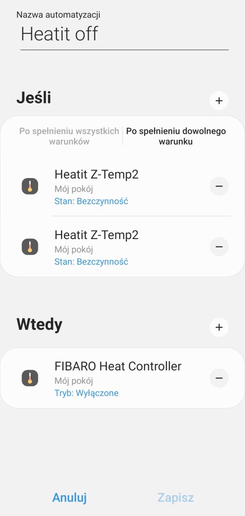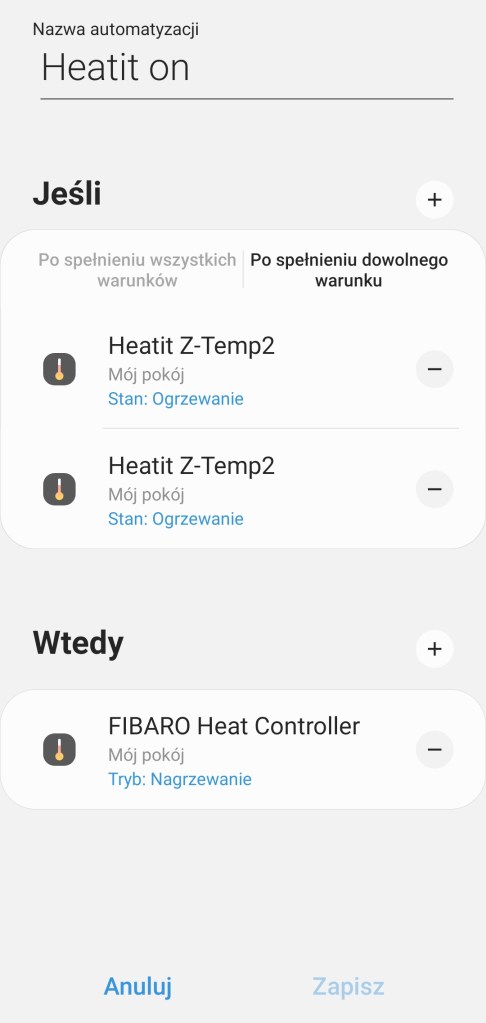 Myśmy mieli możliwość przetestowania termostatu Heatit z głowicą termostatyczną Heat Controller od FIBARO. Sterowanie ogrzewaniem oparliśmy na zmianie stanów termostatu i głowicy. Podstawowym założeniem było na głowicy Heat Controller ustawić dużo wyższą temperaturę nagrzewania. W tym momencie utworzyliśmy automatyzacje (screeny poniżej), jeśli termostat po obniżeniu temperatury w pomieszczeniu przejdzie w stan ogrzewania, przechodzi w niego również głowica, która otwiera obieg wody w kaloryferze. Po osiągnięciu zadanej temperatury nagrzewania w termostacie, Z-Temp2 przechodzi w stan bezczynności, wyłączając głowicę i zamykając obieg wody.