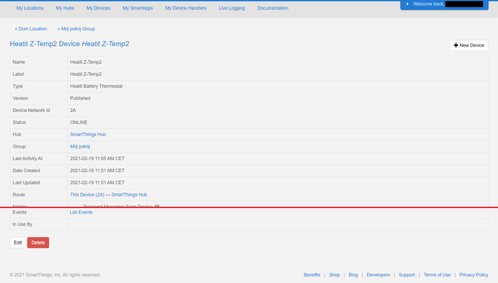Kolejno wchodzimy w „My Device” i odnajdujemy termostat, może się kryć pod inną nazwą. Klikamy nazwę i przechodzimy do szczegółów urządzenia, na końcu strony, klikamy „Edit”.