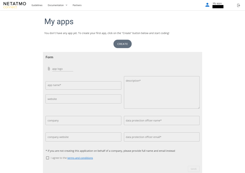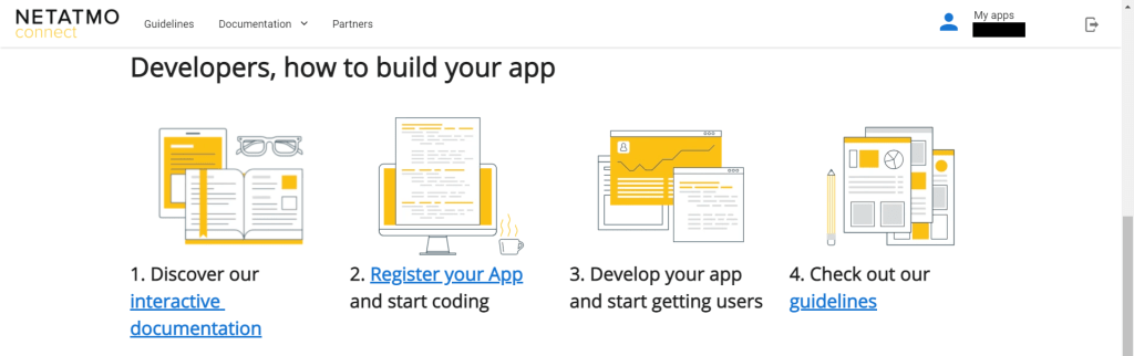Niestety Netatmo Weather Station nie jest wspierane przez aplikację SmartThings. Na szczęście dzięki społeczności SmartThings powstał niestandardowy program obsługi urządzenia. W pierwszej kolejności musimy zarejestrować naszą aplikację na stronie Netatmo dla developerów: dev.netatmo.com. Na stronie logujemy się na nasze konto Neatatmo i szukamy „Register your App and start coding” i kliknij.