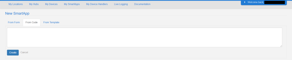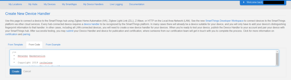 Po zainstalowaniu SmartApp możemy przejść do instalacji niestandardowych programów obsługi dla modułów stacji pogody. Wracamy do sekcji „My Device Handlers”, i tworzymy nowy program „+ Create New Device Handler” w prawym górnym rogu, klikamy „From Code”. Szczegółową instrukcję instalacji niestandardowego programu obsługi wraz ze screenami można znaleźć we wcześniejszym wpisie.