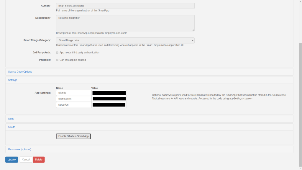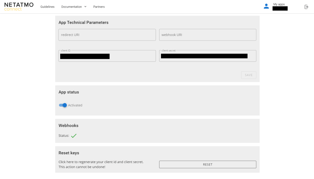 Na następnej stronie rozwijamy sekcje „Settings”. Wpisujemy zapisane „ClientID” oraz „Secret”, które otrzymaliśmy wcześniej podczas tworzenia aplikacji na Netatmo DEV.