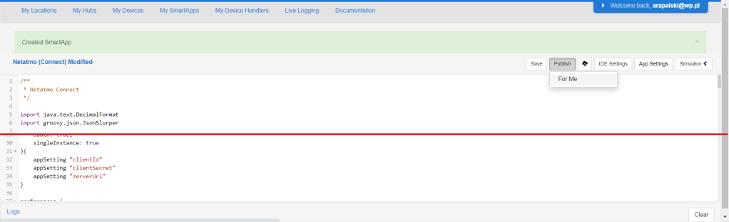 Po skopiowaniu kodu, kliknij „Publish” >> „For Me”. Po opublikowniu SmartApp, konieczna jest zmiana jej ustawień. Klikamy „App Settings”.