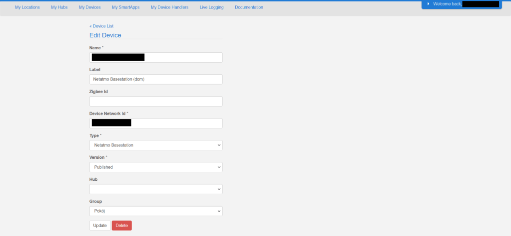 Tutaj musimy zmienić typ (program sterowania) modułu, klikamy „Type” i rozwijamy listę sterowników. Na dole rozwiniętej listy powinien znajdować się nasz niestandardowy program obsługi, wybieramy odpowiedni dla naszego modułu. Po czym klikamy „Update”, po chwili urządzenie powinno zacząć prawidłowo funkcjonować z aplikacją SmartThings.