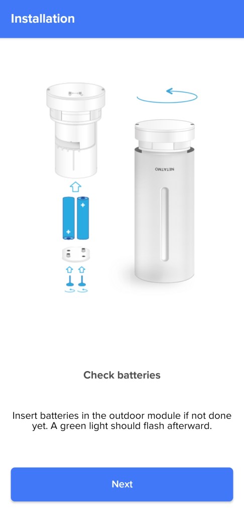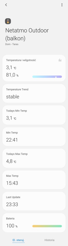 Zewnętrzny moduł stacji pogody Netatmo, w głównym panelu informuje o zmierzonej temperaturze i wilgotności powietrza. Kolejny parametr to trend temperatury – czy spada „down”, rośnie „up”, czy jest stabilna „stable”. „Todays Min Temp”, czyli dzisiejsza minimalna temperatura na dworze. Kolejna belka podaje godzinę rejestracji minimalnej temperatury. Dalej mamy „Todays Max Temp” – czyli dzisiejsza maksymalna temperatura na zewnątrz, a poniżej godzina rejestracji maksymalnej temperatury. Wskaźniki resetują się każdego dnia o północy. Przed ostatnia belka informuje o czasie ostatniej aktualizacji pomiarów. Na koniec mamy informację o procentowym zużyciu baterii.