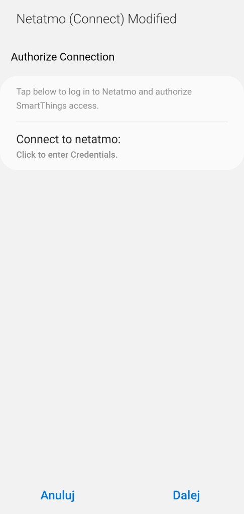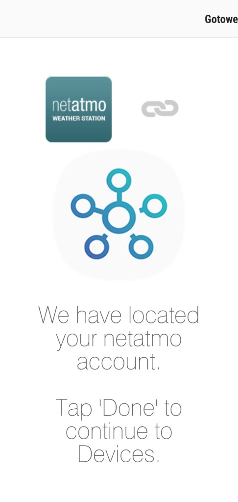 Aby zainstalować Netatmo Weather Station w ekosystemie SmartThings należy na ekranie głównym mobilnej aplikacji SmartThings rozwinąć lewe menu. Kolejno „SmartApps” i przycisk dodaj „+”. Teraz wybieramy z pośród listy „Netatmo (Connect) Modified”. Autoryzujemy połączenie z kontem Netatmo. Klikamy „Click to enter Credentials”, zostaniemy przeniesieni do strony Netatmo, gdzie logujemy się na swoje konto i akceptujemy dostęp SmartThings do danych. Na zakończenie klikamy „Gotowe”. Po zamknięciu strony, klikamy „Dalej”. Ukaże się nam panel konfiguracji SmartApps. Wybieramy moduły naszej nowej stacji pogody oraz poszczególne jednostki dla parametrów (Rain, Pressure, Wind, Time Format). Po kliknięciu na dole „Gotowe”, wszystkie moduły ukażą się w sekcji „Brak przypisanego pokoju” na dole głównego ekranu aplikacji SmartThings.