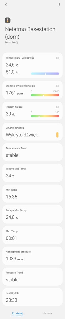 W pierwszej kolejności przyjrzymy się stacji bazowej Netatmo. W głównym panelu modułu mamy informację o odczytanej temperaturze pokojowej, wilgotności, stężeniu dwutlenku węgla, poziomu hałasu i stan czujnika dźwięku. Jest tam również informacja o trendzie temperatury – czy spada „down”, rośnie „up” ,czy stabilna „stable” oraz „Todays Min Temp”, czyli dzisiejsza minimalna temperatura w pokoju. Kolejna belka podaje godzinę rejestracji minimalnej temperatury. Dalej mamy „Todays Max Temp” – czyli dzisiejsza maksymalna temperatura w pokoju. Poniżej godzina rejestracji maksymalnej temperatury. Kolejne parametry to ciśnienie atmosferyczne „Atmospheric pressure” oraz jego trend. Ostatnia informacja to godzina ostatniej aktualizacji pomiarów. Wskaźniki „Todays Min Temp” i „Todays Max Temp” są resetowane każdego dnia o północy.