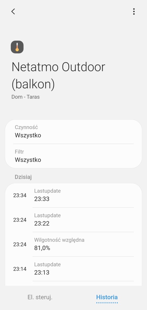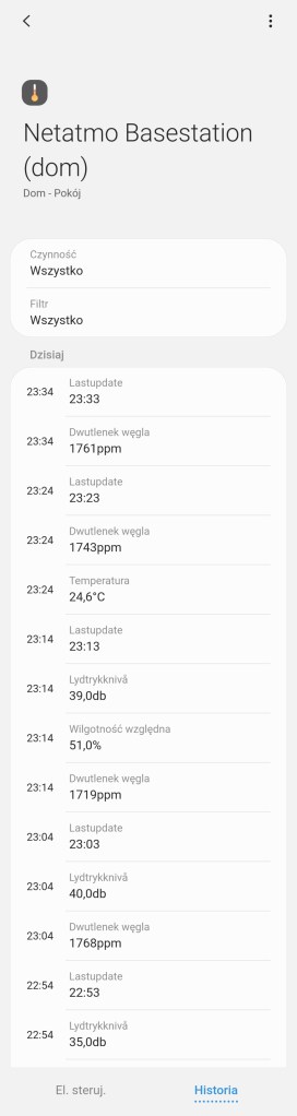 Panel „Historii” również nie różni się znacznie od innych sensorów, mamy dostęp do sortowania i przestudiowania historii działań urządzenia. W ustawieniach „Edytuj” mamy standardową możliwość zmiany nazwy, lokalizacji oraz pokoju. W ustawieniach mamy podaną informację, gdzie zmienić jednostki oraz okres odświeżania danych.