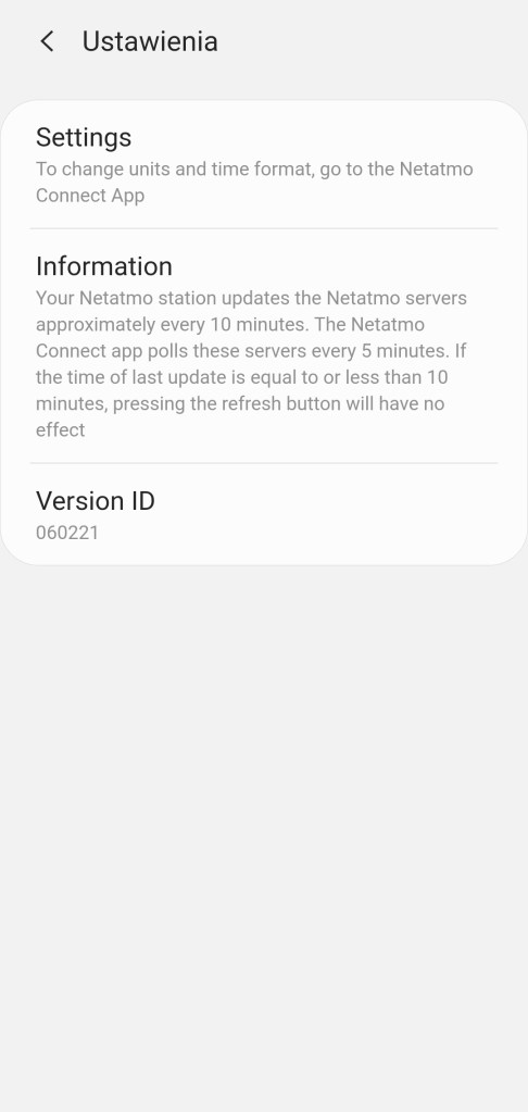 input title: "Information", description: "Your Netatmo station updates the Netatmo servers approximately every 10 minutes. The Netatmo Connect app polls these servers every 5 minutes. If the time of last update is equal to or less than 10 minutes, pressing the refresh button will have no effect", displayDuringSetup: false, type: "paragraph", element: "paragraph"