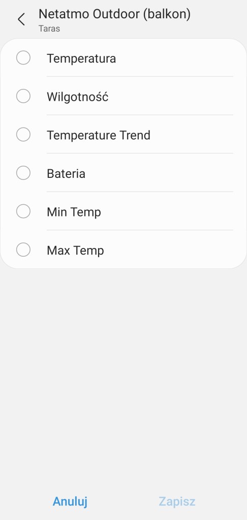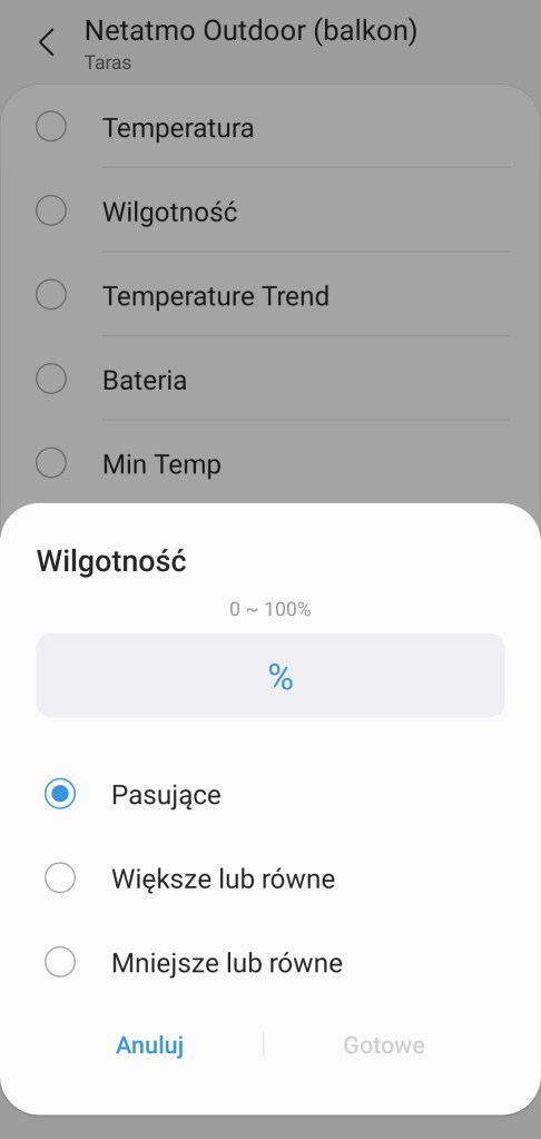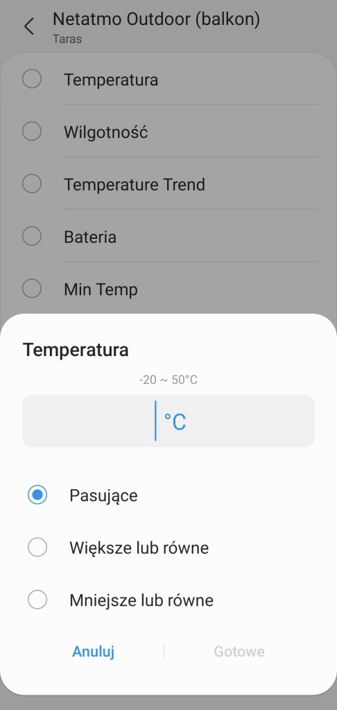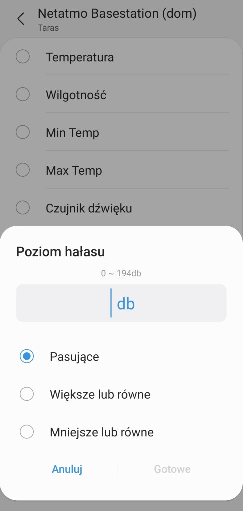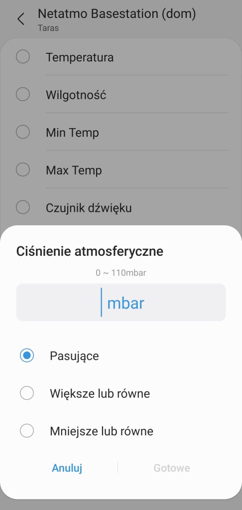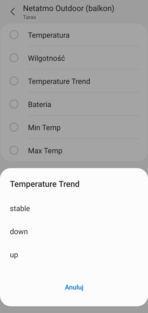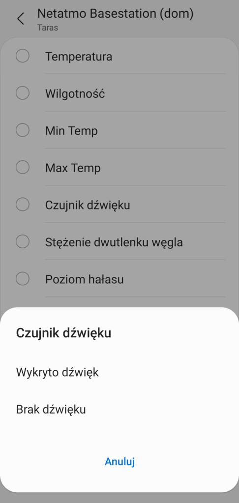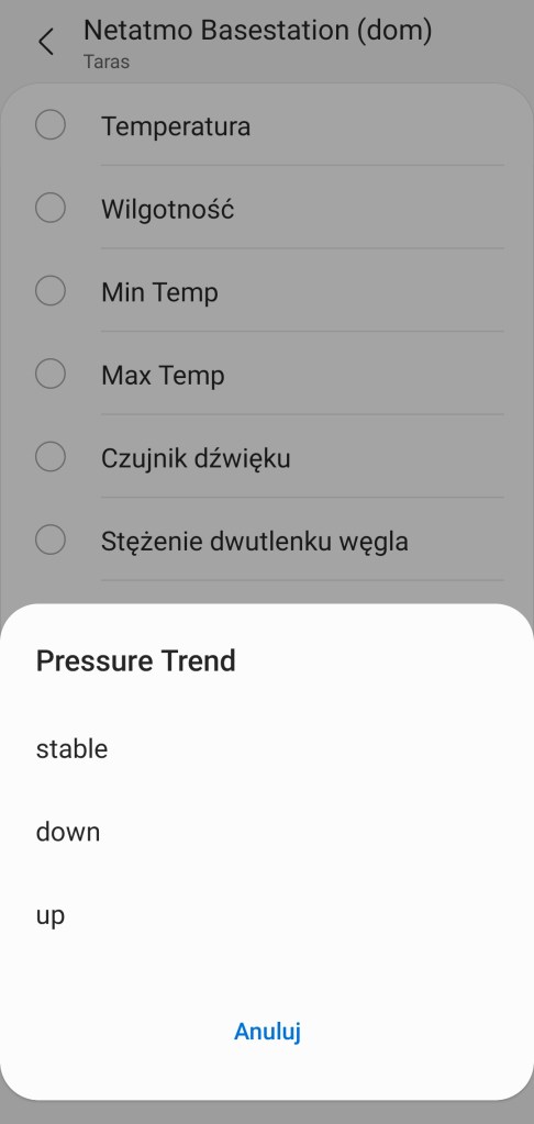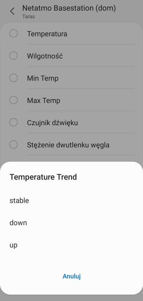 Główny moduł stacji meteorologicznej przy tworzeniu automatyzacji „Jeśli … to Wtedy” pozwala na wybranie kolejno (zakresy w nawiasie): temperatury (-20 – 50°C), wilgotności (0-100%), min temp (-20 – 50°C), max temp (-20 – 50°C), czujnik dźwięku (Brak dźwięku/Wykryto dźwięk), stężenie CO2 (0 – 1 000 000ppm), poziom hałasu (0 -194dB), ciśnienie atmosferyczne (0 – 110mbar) – tutaj ewidentny błąd kodu programu, temperature trend (stable, down, up), pressure trend (stable, down, up). Ze względu na specyfikę urządzenia, możliwe jest tylko wykorzystanie warunku „jeśli”.