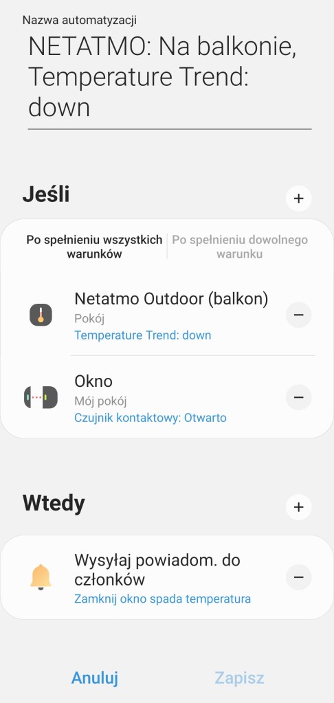 • tutaj sytuacja odwrotna, kiedy temperatura na koniec dnia już spada, a okno jest otwarte, otrzymamy powiadomienie o jego zamknięciu i uniknięciu straty cennej energii cieplnej po nagrzaniu pokoju