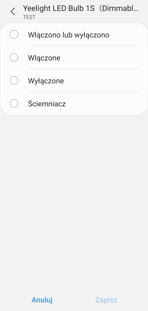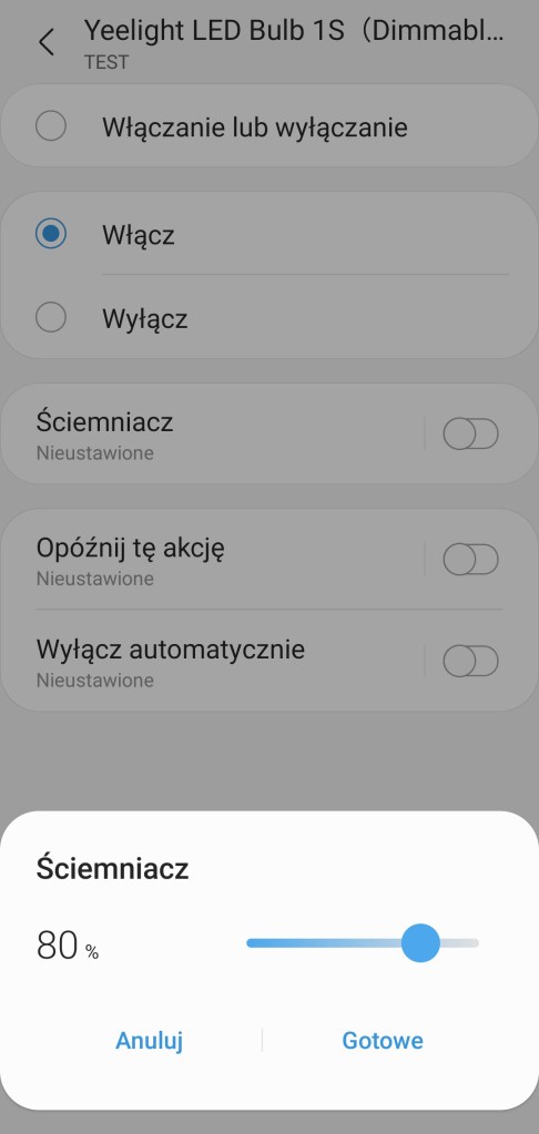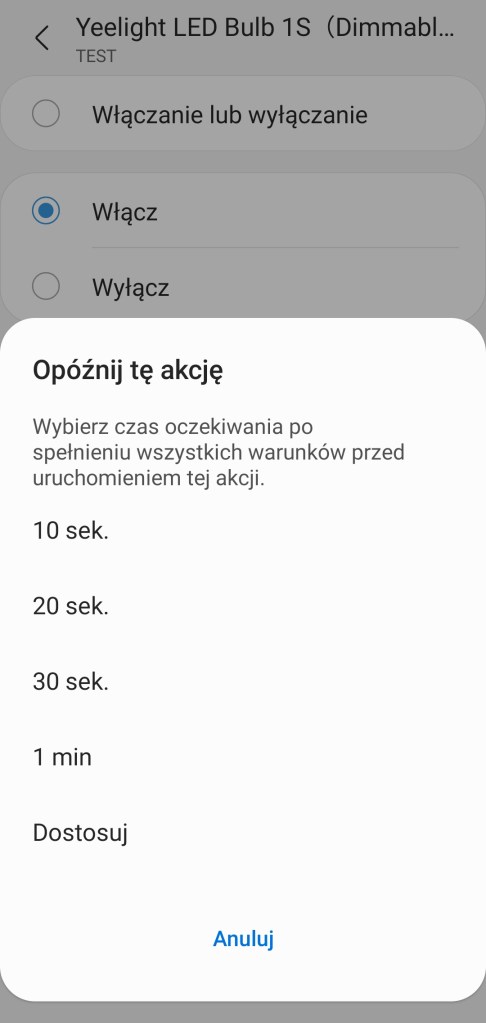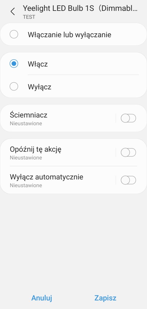 Tworzenie automatyzacji „Jeśli … to Wtedy” musimy podzielić na dwa etapy, ponieważ znacznie się różnią. W pierwszej możliwości „Jeśli” urządzenie pozwala na wybranie opcji „Włączono lub wyłączono” czyli zmiana stanu, oraz „Włączone” i „Wyłączone”, w tym czas jak długo ma być zachowany ten stan oraz wartość ściemniacza, w zakresie 1 – 100%. W drugiej możliwości „Wtedy”, żarówka pozwala na ciut więcej, ponownie mamy opcje „Włączono lub wyłączono” czyli zmiana stanu, oraz „Włączone” i „Wyłączone”. Ustawienie jasności żarówki z zakresu 1 – 100%. Akcję uruchomienia możemy opóźnić o dowolny czas, jak i wyłączyć automatycznie po ustalonym czasie.