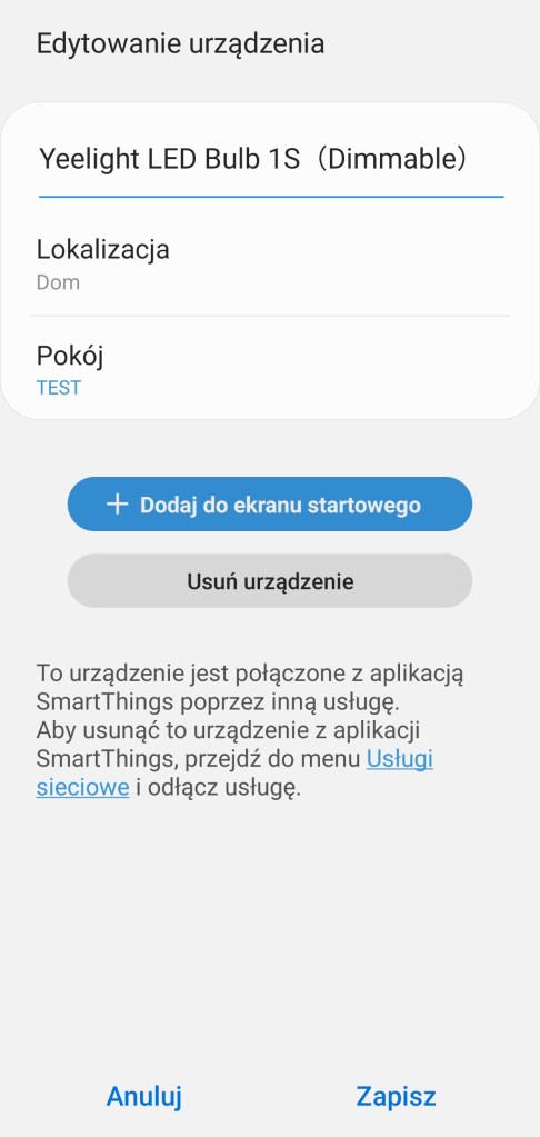 Posiadamy dwie możliwości usunięcia żarówki z ekosystemu SmartThings. Pierwszym z nich jest odłączenie usługi sieciowej Yeelight z aplikacji SmartThings. Pamiętaj jednak, że usunięte zostaną wszystkie inne urządzenia Yeelight. Usunięcie z aplikacji skutkuje również wyczyszczeniem urządzeń z wszelkich przypisanych automatyzacji i scenerii. Pełną instrukcję odłączenia usług znajdziesz tutaj.