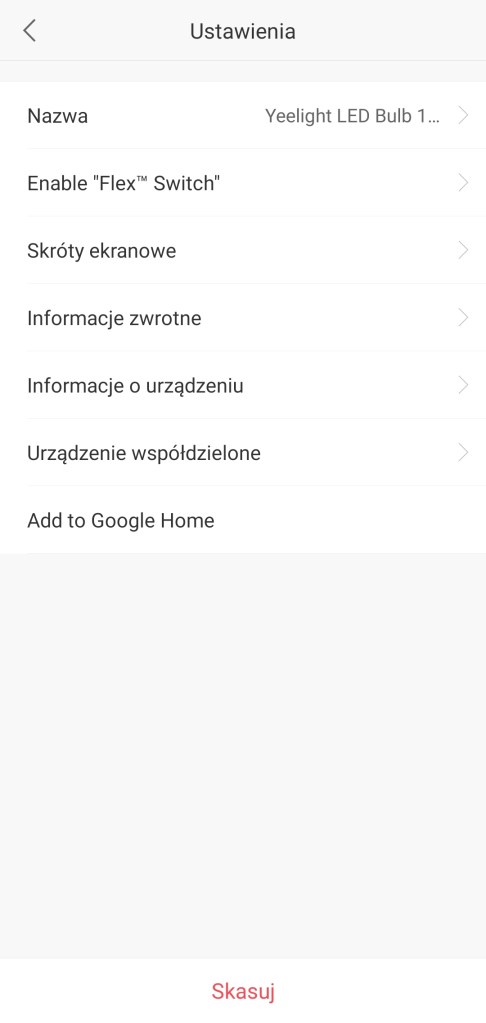 Aby uniknąć ponownego wyszukania urządzenia przez aplikację SmartThings, należy również usunąć żarówkę z aplikacji Yeelight. W tym celu otwieramy aplikację Yeelight, przechodzimy do głównego panelu starowania żarówki. Przechodzimy do ustawień (prawy górny róg). Na dole klikamy Skasuj a następnie potwierdzamy Ok.