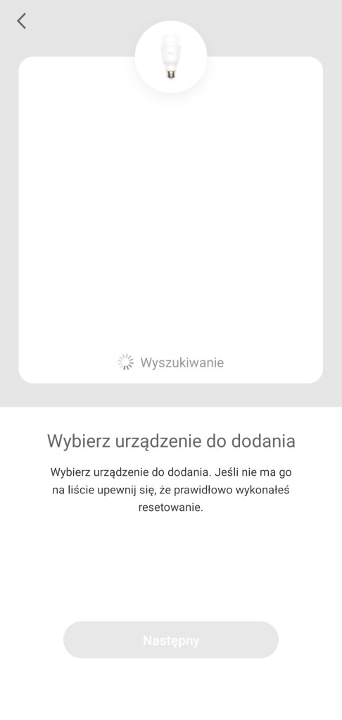 Po przejściu do ekranu głównego aplikacji Yeelight, klikamy „+” w prawym górnym rogu ekranu. Z listy urządzeń wyszukujemy „Yeelight Smart LED Bulb 1S”. Zostaniemy poproszeni o zresetowanie żarówki poprzez włączenie/wyłączenie światła 5 razy. Po zresetowaniu aplikacja przystąpi do wyszukiwania żarówki, po jej znalezieniu, wybieramy ją zaznaczając „ptaszkiem” i klikamy „Następny”. Nastąpi teraz połączenie żarówki z naszym routerem Wi-Fi, klikamy „Connect to another router”. Zostaną wyszukane pobliskie sieci, wybieramy swoją, logujemy się, po potwierdzeniu połączenia. Nastąpi łączenie żarówki z routerem i siecią Wi-Fi, po sukcesie, możemy zmienić nazwę nowej żarówki, klikamy „Następny”. Zgadzamy się bądź nie na sterowanie lokalne w aplikacji Yeelight, klikamy „Wykonane”. Ukaże się ekran główny sterowania Smart LED Bulb 1S – żarówka została pomyślnie skonfigurowana w aplikacji Yeelight.