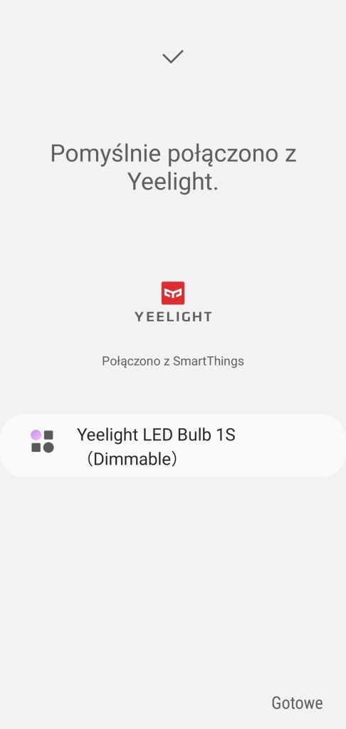 Po dodaniu wszystkich urządzeń w aplikacji Yeelight, możemy przystąpić do połączenia usług Yeelight i SmartThings. Przechodzimy do aplikacji SmartThings, aby dodać urządzenie do inteligentnego domu. Na ekranie głównym aplikacji, klikamy „plus”, kolejno „Urządzenie”, znajdujemy markę Yeelight >> Oświetlenie. I znów Yeelight, wybieramy lokalizację i pokój dla urządzenia. Zostaniemy poproszeni o zalogowanie się do konta Xiaomi. Po zalogowaniu wyświetli się komunikat o poprawnym połączniu między producentami, zamykamy stronę poprzez kliknięcie „x” w lewym górnym rogu. Po chwili ukaże się lista, wszystkich urządzeń, dodanych wcześniej do aplikacji Yeelight, w tym Smart LED Bulb 1S, klikamy „Gotowe”.