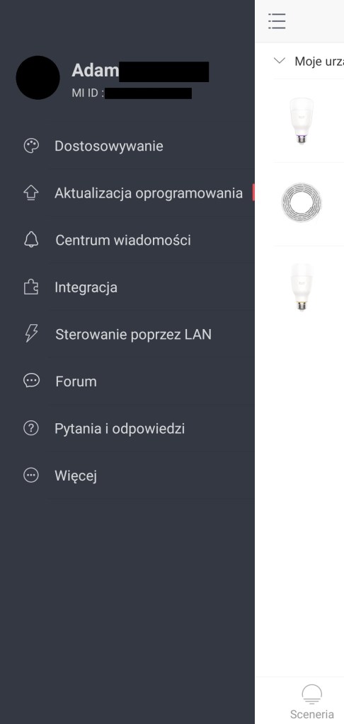 Lewe menu aplikacji Yeelight