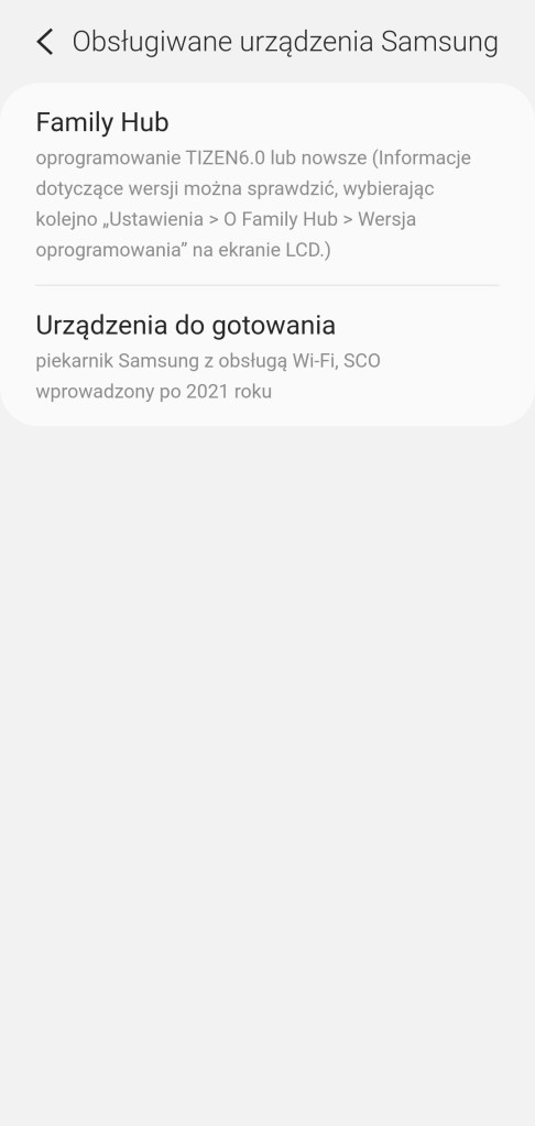 - Family Hub z wersją oprogramowania TIZEN 6.0 lub nowszy, aby sprawdzić wersję systemu należy na lodówce wybrać „Ustawienia” >> „O Family Hub” >> „Wersja oprogramowania”.