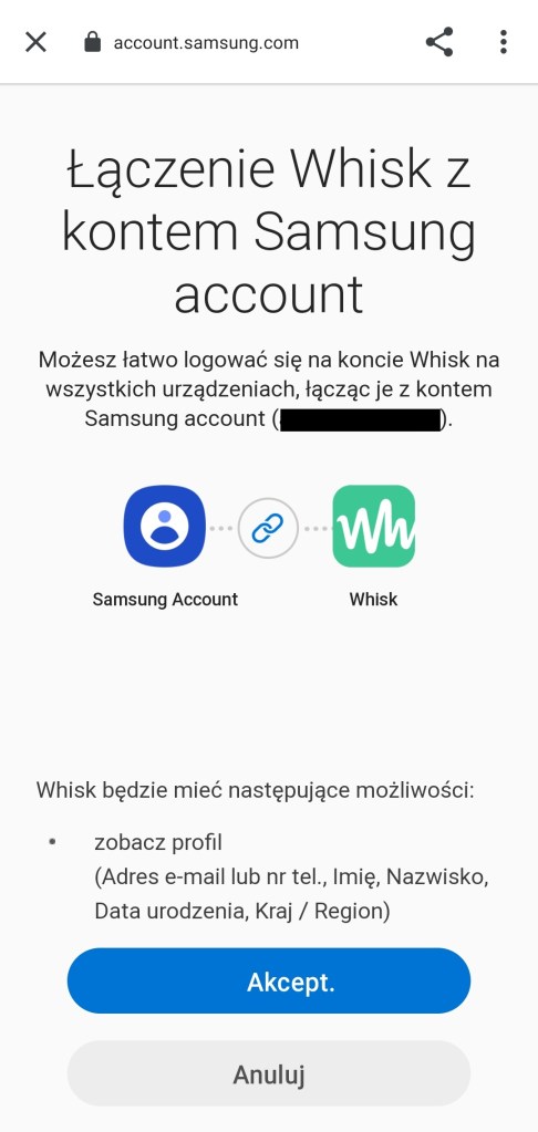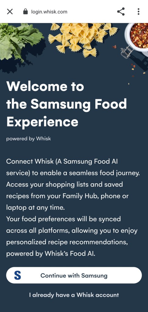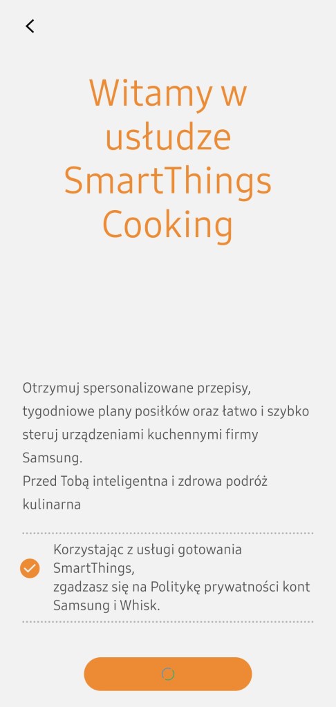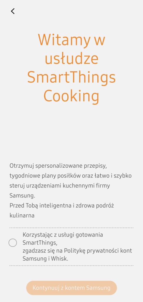 Teraz możemy przejść do konfiguracji SmartThings Cooking. Przywita nas ekran powitalny usługi, akceptujemy politykę prywatności i przystępujemy do łączenia usług Samsung i Whisk, logujemy się przy pomocy konta Samsung do Whisk.