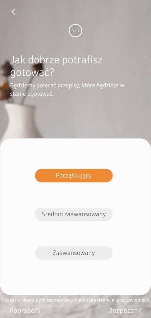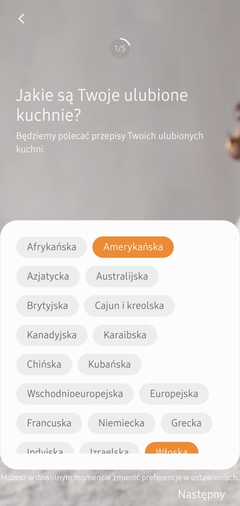 Personalizujemy osobiste konto o nasze preferencje żywieniowe, zostaniemy zapytani o naszą ulubioną kuchnię, ulubione składniki, alergię, stosowaną dietę oraz nasz poziom umiejętności gotowania. Nastąpi wyszukiwanie przepisów i pojawi się ekran główny usługi.