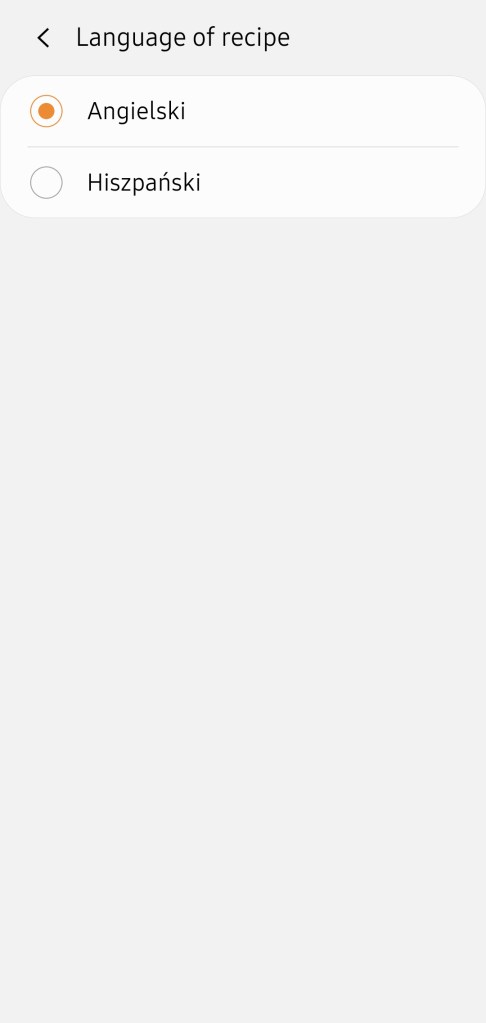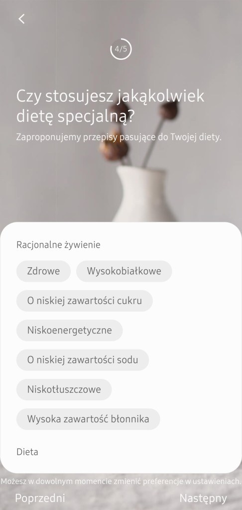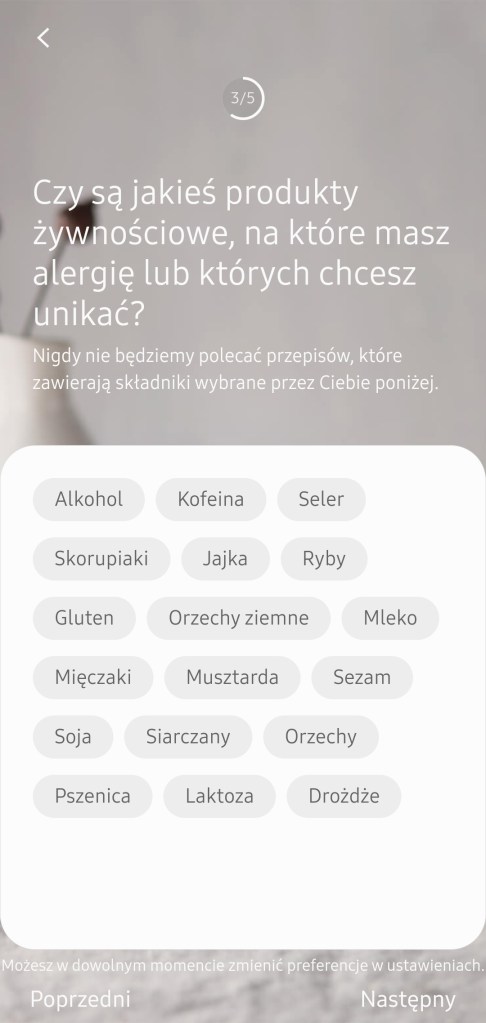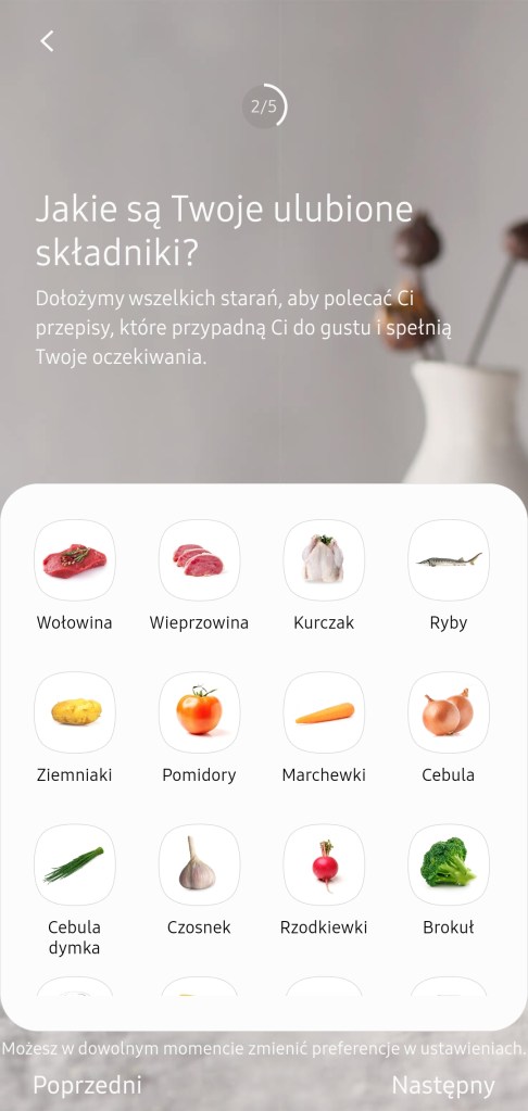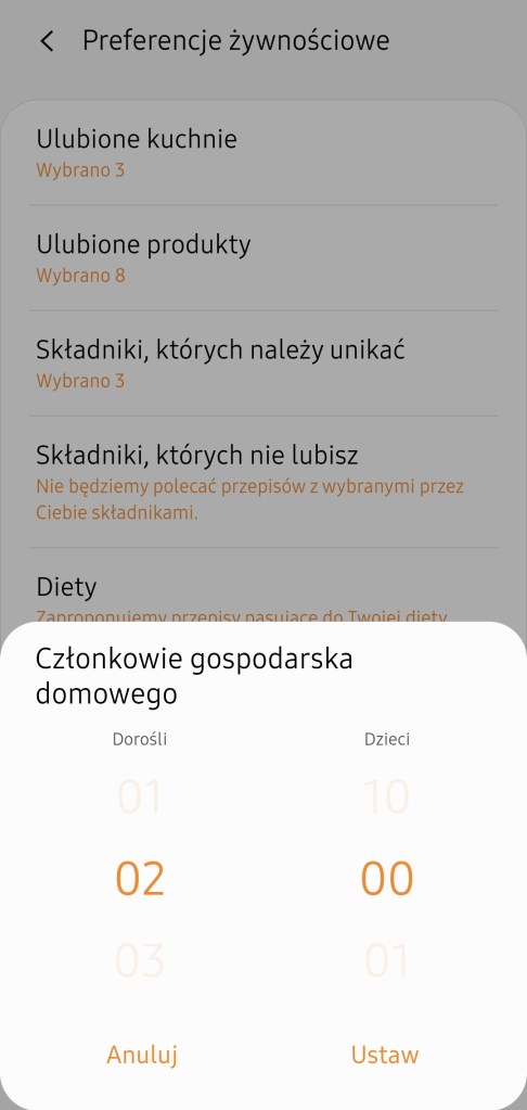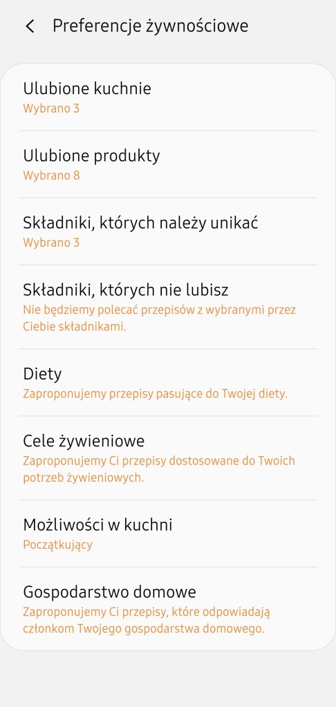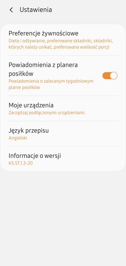 Klikając w prawym górnym rogu ekranu Ustawienia, mamy możliwość wcześniej ustawionych preferencji żywieniowych (Ulubione kuchnie, Ulubione produkty, Składniki, których należy unikać, Składniki, których nie lubisz, Diety, Cele żywieniowe, Możliwości w kuchni oraz Gospodarstwo domowe). Kolejną opcją jest włączenie powiadomień z planera posiłków, który został utworzony w ramach wcześniejszych ustawień. Moje urządzenia to lista wszystkich, urządzeń Samsung służących do gotowania. Mamy możliwość ustawienia języka przepisów, niestety dostępne na chwilę obecną jest tylko język angielski i hiszpański.