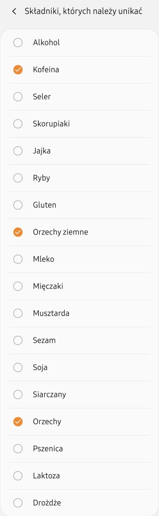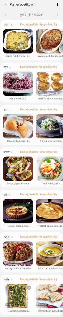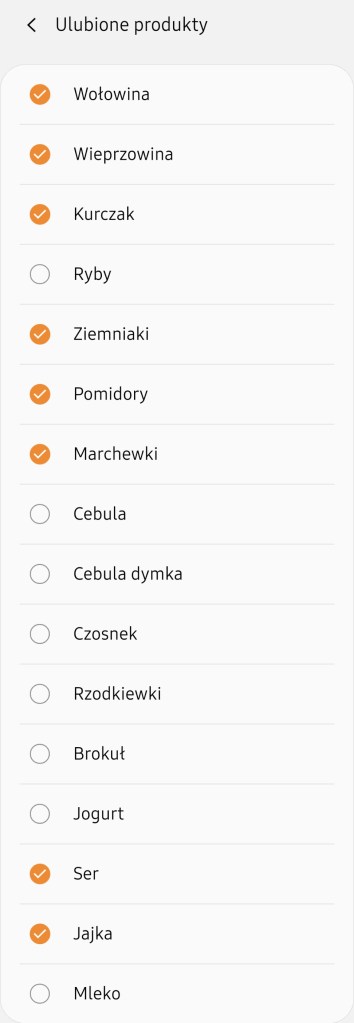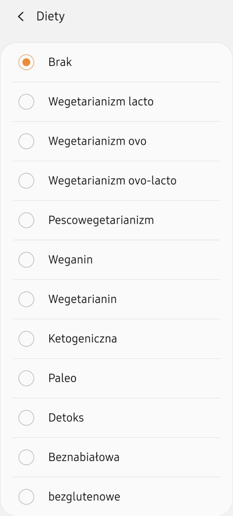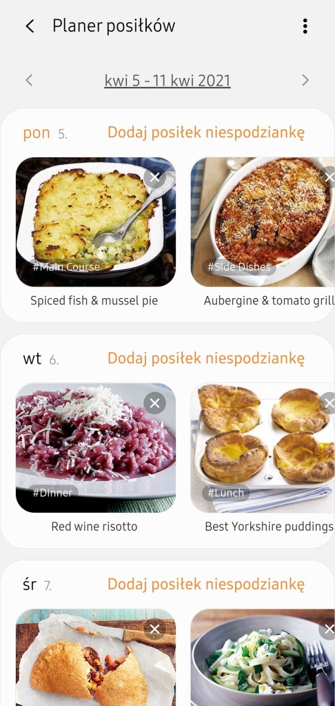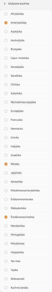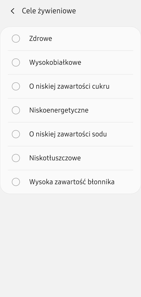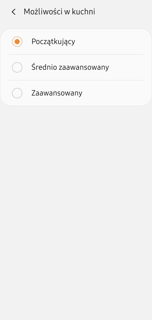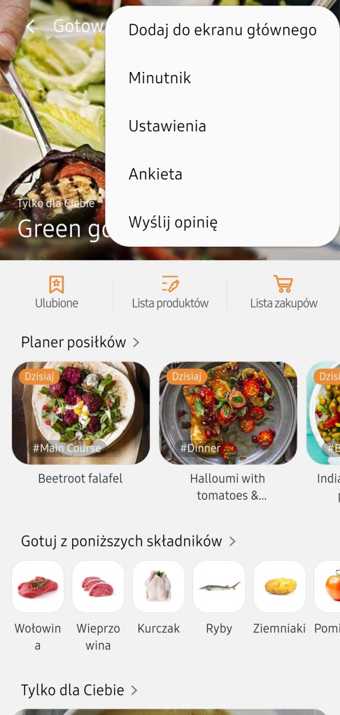 Klikając w prawym górnym rogu ekranu Ustawienia, mamy możliwość wcześniej ustawionych preferencji żywieniowych (Ulubione kuchnie, Ulubione produkty, Składniki, których należy unikać, Składniki, których nie lubisz, Diety, Cele żywieniowe, Możliwości w kuchni oraz Gospodarstwo domowe). Kolejną opcją jest włączenie powiadomień z planera posiłków, który został utworzony w ramach wcześniejszych ustawień. Moje urządzenia to lista wszystkich, urządzeń Samsung służących do gotowania. Mamy możliwość ustawienia języka przepisów, niestety dostępne na chwilę obecną jest tylko język angielski i hiszpański.