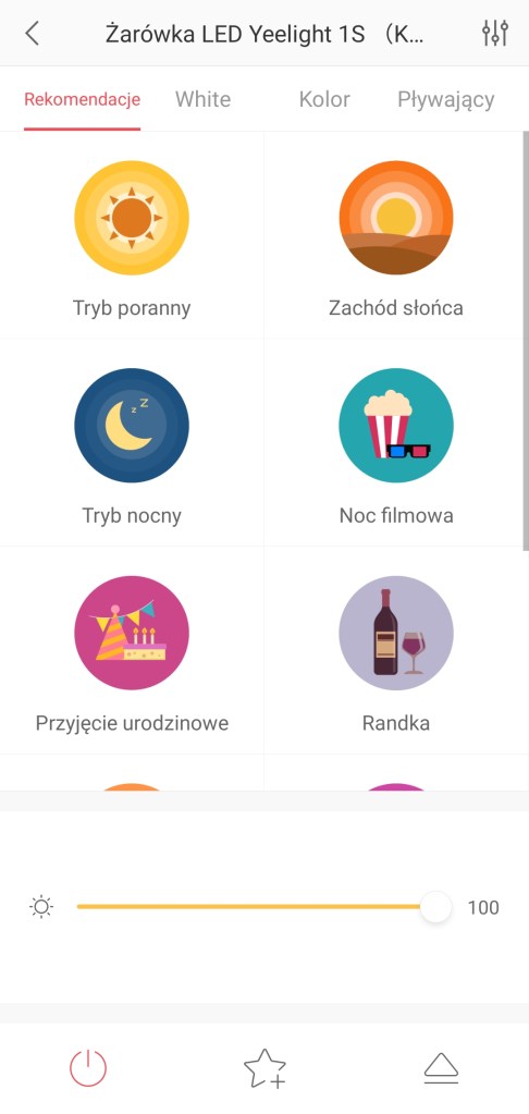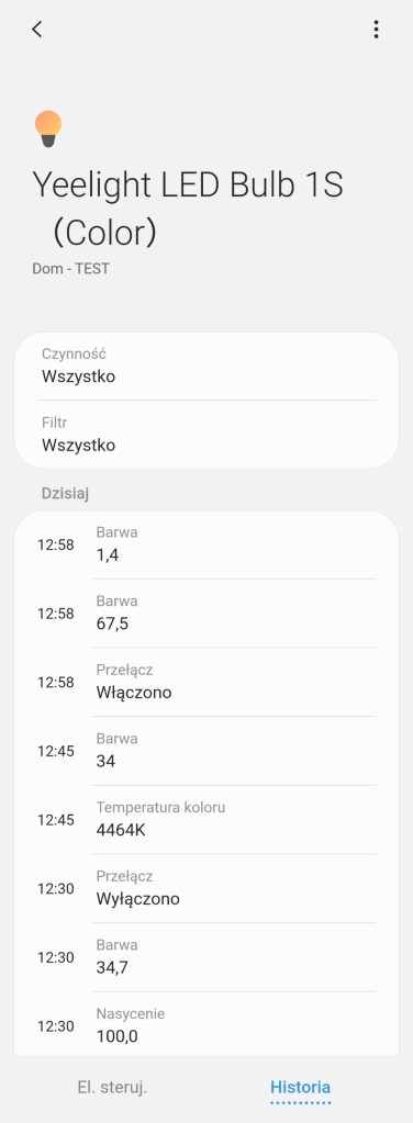 W głównym panelu aplikacji mamy możliwość włączenia/wyłączenia żarówki, zaprogramowania szybkich automatyzacji: włączenia i wyłączenia żarówki LED oraz pewną formę minutnika. Poniżej posiadamy możliwość ustawienia dowolnego koloru z palety barw RGB, i historię pięć ostatnio używanych barw oraz sześć sugestii. Kolejna belka pozwala na ustawienie temperatury światła w zakresie 2200 K – 9000 K, choć rzeczywista temperatura barwowa z specyfikacji to 1700 – 6500 K. Ostatnia opcja to ustawienia ściemniacza od 1 do 100%. Pod ściemniaczem posiadamy również pięć kół, będących przyciskami ustawiającymi ściemniacz na kolejno od lewej 10%, 30%, 50%, 70% oraz 90% jasności. Panel „Historii” nie różni się znacznie od innych urządzeń, mamy dostęp do sortowania i przestudiowania historii działań żarówki. W ustawieniach „Edytuj” mamy standardową możliwość zmiany nazwy i przypisanego pokoju.