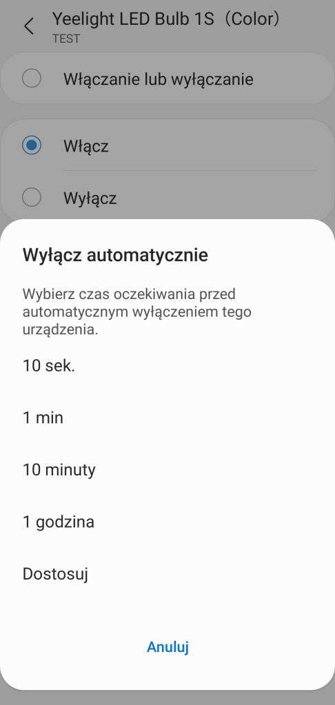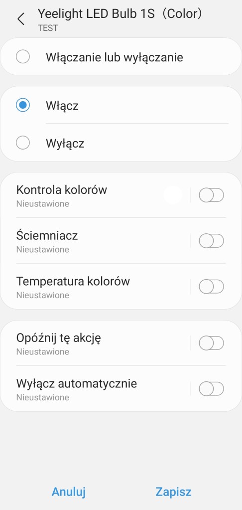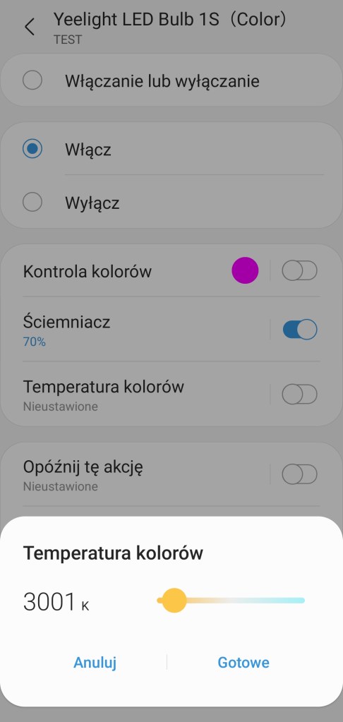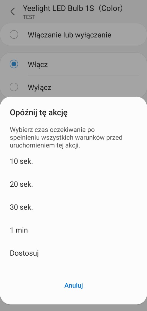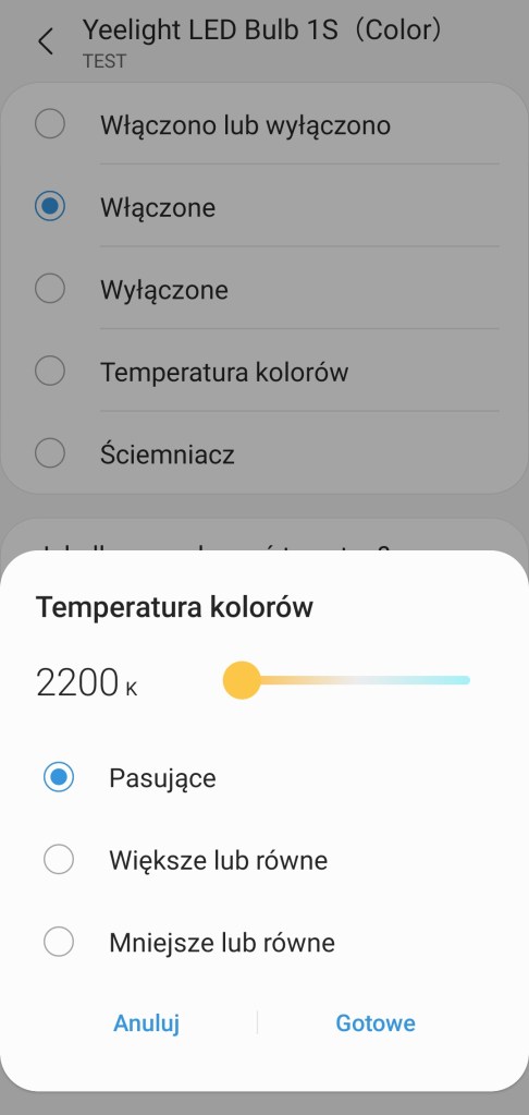 Tworzenie automatyzacji „Jeśli … to Wtedy” musimy podzielić na dwa etapy, ponieważ znacznie się różnią. W pierwszej możliwości „Jeśli” urządzenie pozwala na wybranie opcji „Włączono lub wyłączono” czyli zmiana stanu, oraz „Włączone” i „Wyłączone”, dodatkowo opcję jak długo ten stan musi się utrzymać, zanim uaktywni się automatyzacja. Poniżej wartość temperatury kolorów w zakresie 2200 K – 9000 K (choć realnie z specyfikacji wynika: 1700 – 6500 K) oraz wartość ściemniacza, w zakresie 1 – 100%, w tym czy jest większa bądź mniejsza niż zadana. W drugiej możliwości „Wtedy”, żarówka LED pozwala na ciut więcej, ponownie mamy opcje „Włączono lub wyłączono” czyli zmiana stanu, oraz „Włączone” i „Wyłączone”. Ustawienie konkretnego koloru z palety barw RGB oraz ustawienie jasności z zakresu 1 – 100%. Ostatnią opcją jest ustawienie temperatury koloru światła znów w zakresie 2200 – 9000K. Akcję uruchomienia możemy opóźnić o dowolny czas, jak i wyłączyć automatycznie po ustalonym czasie.