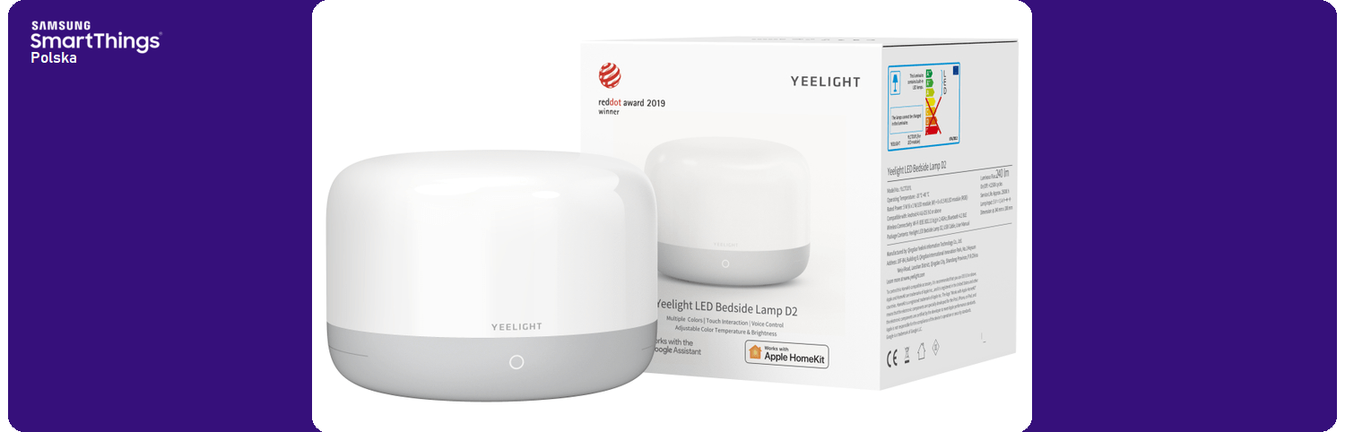 Yeelight Bedside D2 to lampa biurowa, z przeznaczeniem jako lampka nocna. Wyróżnia się sposobem sterowania, który opiera się na dwóch dotykowych suwakach bocznych odpowiadających z lewej strony za zmianę barwy, a z prawej za poziom jasności. Dodatkowy przycisk pośrodku odpowiada za włączenie i wyłączenie, a przytrzymanie go przez 3s, umożliwi przełączenie się między dostosowywaniem temperatury i kolorów na lewym suwaku. To nie jedyna możliwość włączenia/wyłączenia lampy nocnej, aby w nocy nie szukać przycisków, możemy lampę dotknąć dwukrotnie, aby rozświetlić pokój. Urządzenie pozwala doznać pełną paletą kolorów RBG i temperaturę barwową na poziomie 1700 – 6500 K, posiadająca oczywiście ściemniacz w zakresie 5 – 100%, oraz pochwalić się współczynnikiem oddawania barw na poziomie 80 Ra. Maksymalnie dostaniemy tylko 240 lm, lecz przy lampce nocnej jest to wystarczające. Posiada imponującą żywotność aż do 25 000 godzin. Komunikacja odbywa się po protokole Wi-Fi (802.11 b/g/n 2,4 GHz) lub Bluetooth (4.2 BLE), tym samym w ekosystemie SmartThings oznacza wykorzystanie pośrednictwa serwera, co opóźnia reakcję na komendę. Dużym plusem jest że urządzenie nie wymaga żadnej centrali. Zasilanie opiera się na ładowarce sieciowej 5V 1A/2A, nie mamy tutaj akumulatora. Lampa nocna posiada 14 cm średnicy oraz 10 cm wysokości, a waga to zaledwie 562 gram. Na rynku dostępna jest tylko wersja biała. Dostosowana jest do pracy w pomieszczeniu z temperaturą -10°C – 40°C oraz wilgotnością 0 – 85%.