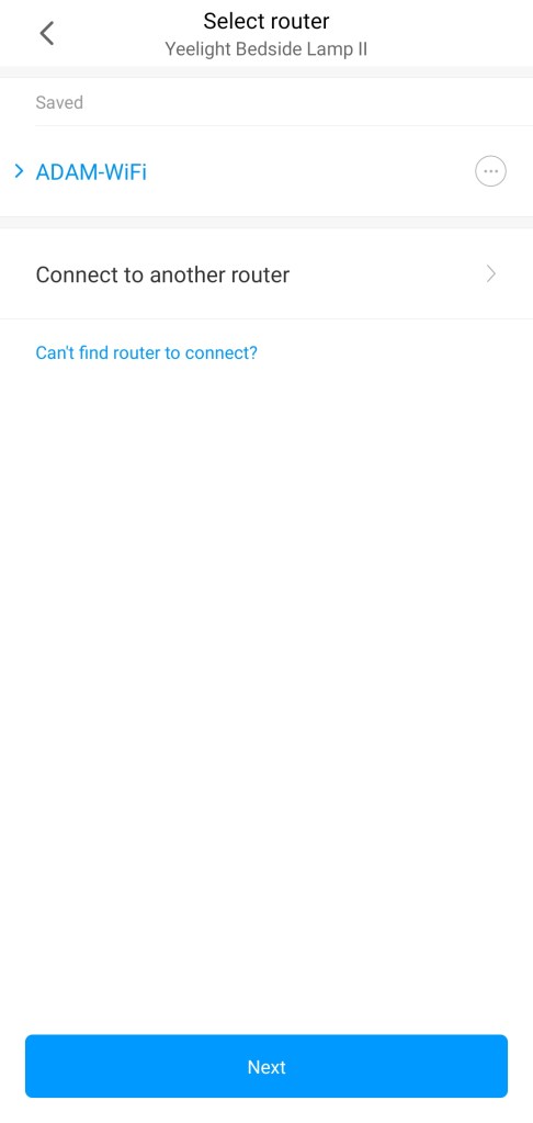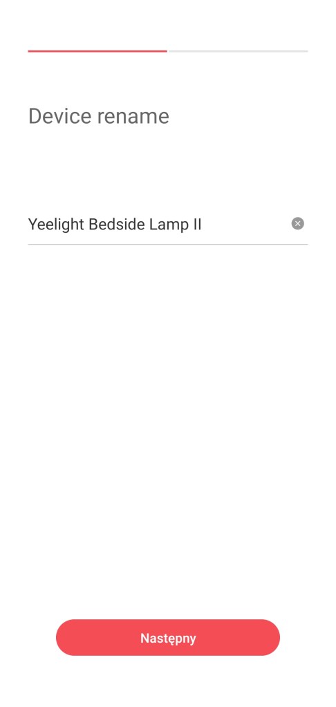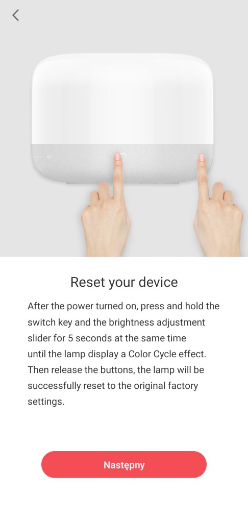 Po przejściu do ekranu głównego aplikacji Yeelight, klikamy Dodaj ( + ) w prawym górnym rogu ekranu, następnie Dodaj urządzenie. Z listy urządzeń wyszukujemy „Bedside Lamp II”. Zostaniemy poproszeni o zresetowanie lamki nocnej. Jednocześnie naciskamy i przytrzymujemy przycisk włączania/wyłączania oraz obszar dotykowy dostosowywania jasności. Kiedy lampa zacznie zmieniać kolory (czerwony, zielony i niebieski), można puścić przyciski. Po zresetowaniu aplikacja przystąpi do wyszukiwania lampy, po jej znalezieniu, wybieramy ją zaznaczając „ptaszkiem” i klikamy Następny. Nastąpi teraz połączenie lampy z naszym routerem Wi-Fi, klikamy Connect to another router. Zostaną wyszukane pobliskie sieci, wybieramy swoją, logujemy się, po potwierdzeniu połączenia. Nastąpi łączenie lampy z routerem i siecią Wi-Fi, po sukcesie, możemy zmienić nazwę nowej lampy nocnej, klikamy Następny. Zgadzamy się na sterowanie lokalne w aplikacji Yeelight, klikamy Wykonane. Ukaże się ekran główny sterowania Bedside D2 – lampa została pomyślnie skonfigurowana w aplikacji Yeelight. Polecam jeszcze sprawdzić czy dostępna jest aktualizacja oprogramowania, otwieramy lewe menu i klikamy Aktualizacja oprogramowania.