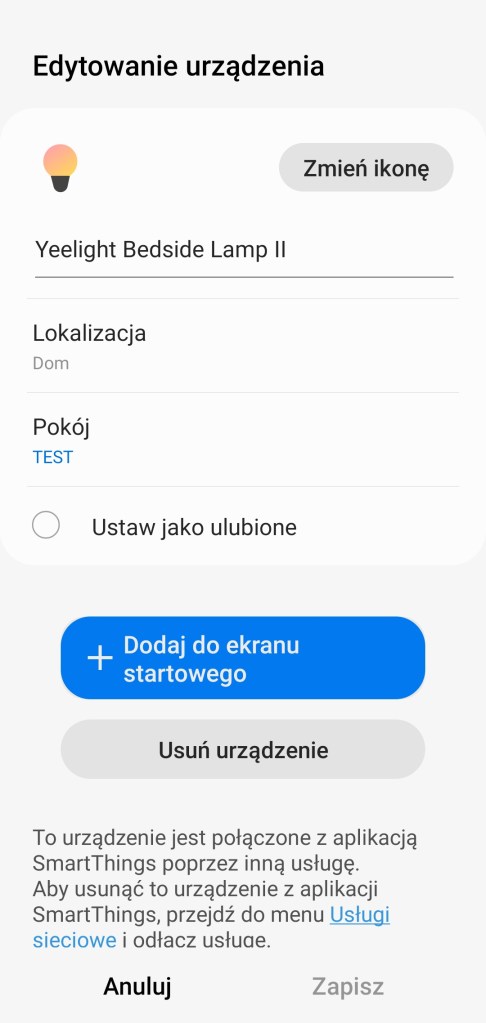 Aby usunąć tylko jedno urządzenie, w naszym wypadku lampę Bedside, z ekosystemu SmartThings, należy wejść w główny ekran urządzenia. Kliknąć Więcej opcji ( ⋮ ) w prawym górnym rogu ekranu, a następnie Edytuj. W panelu edycji, wybieramy Usuń urządzenie. Następnie potwierdzamy operację, stukając Usuń.