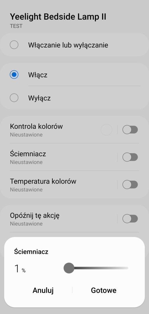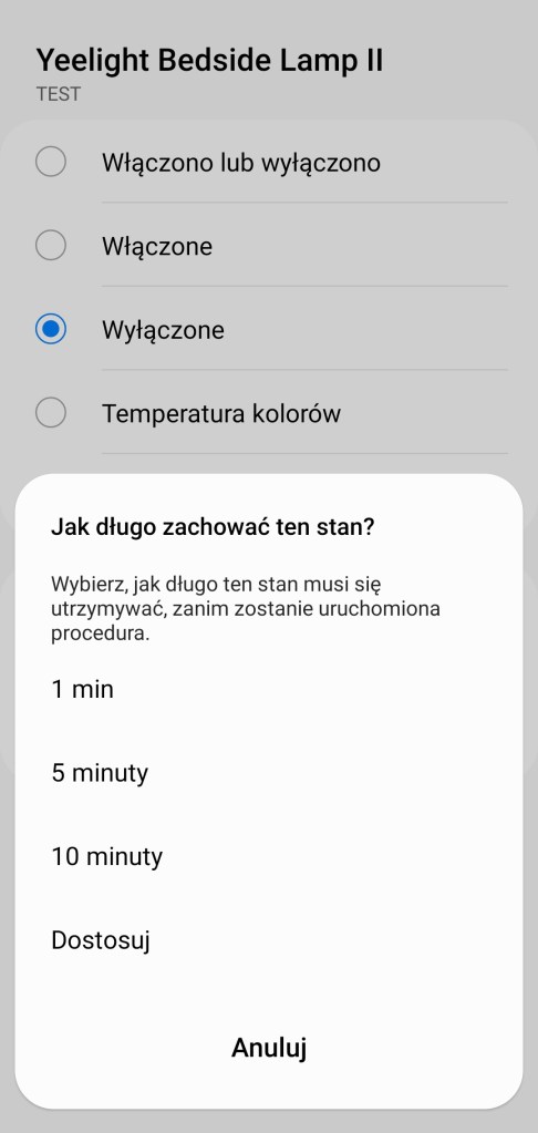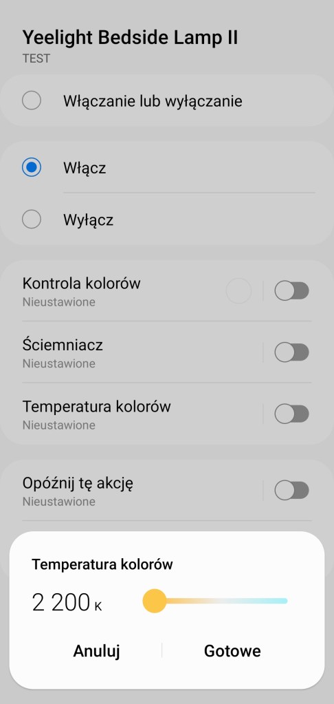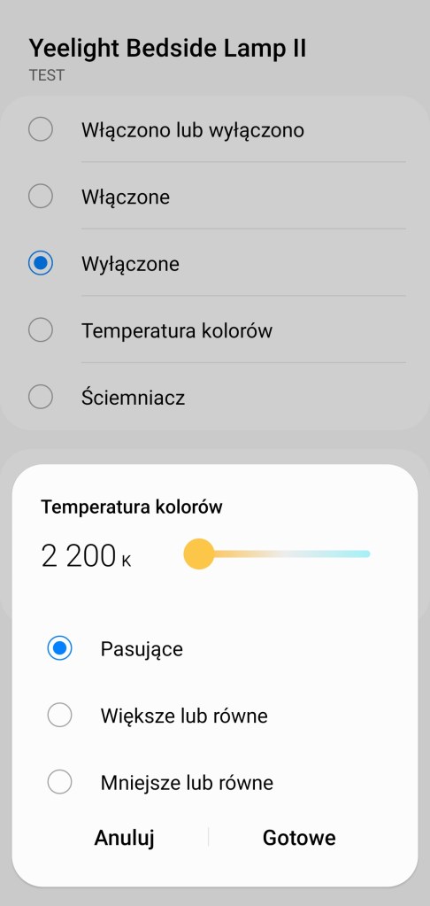 Tworzenie automatyzacji „Jeśli … to Wtedy” musimy podzielić na dwa etapy, ponieważ znacznie się różnią. W pierwszej możliwości „Jeśli” urządzenie pozwala na wybranie opcji „Włączono lub wyłączono” czyli zmiana stanu, oraz „Włączone” i „Wyłączone”, dodatkowo opcję, jak długo ten stan musi się utrzymać, zanim uaktywni się automatyzacja. Poniżej wartość temperatury kolorów w zakresie 2200 K – 9000 K (choć realnie z specyfikacji wynika: 1700 – 6500 K) oraz wartość ściemniacza, w zakresie 1 – 100%, w tym czy jest większa bądź mniejsza niż zadana. W drugiej możliwości „Wtedy”, lampa pozwala na ciut więcej, ponownie mamy opcje „Włączono lub wyłączono” czyli zmiana stanu, oraz „Włączone” i „Wyłączone”. Ustawienie konkretnego koloru z palety barw RGBW oraz ustawienie jasności z zakresu 1 – 100%. Ostatnią opcją jest ustawienie temperatury koloru światła znów w zakresie 2200 – 9000K. Akcję uruchomienia możemy opóźnić o dowolny czas, jak i wyłączyć automatycznie po ustalonym czasie.