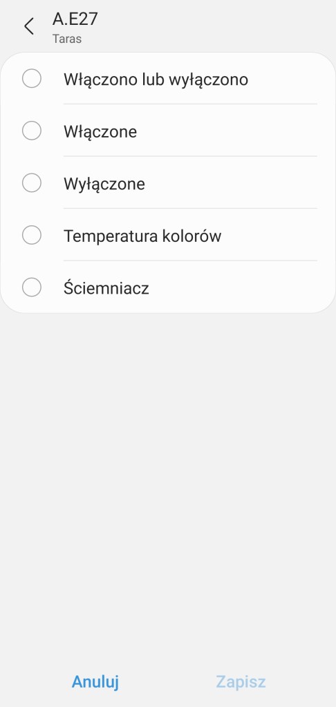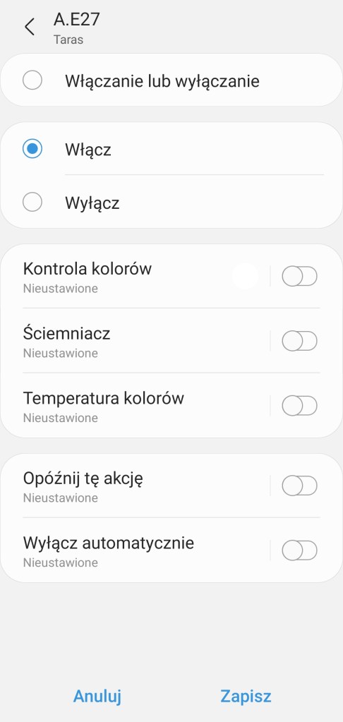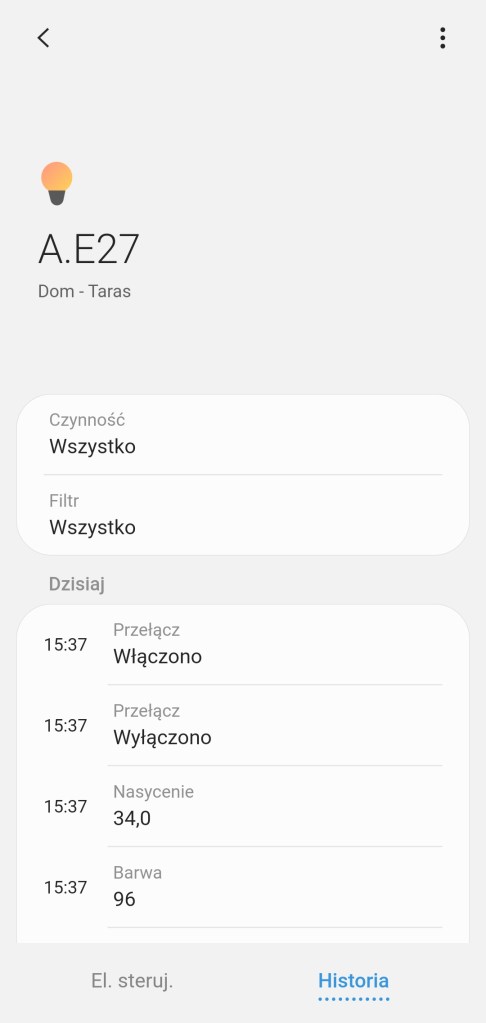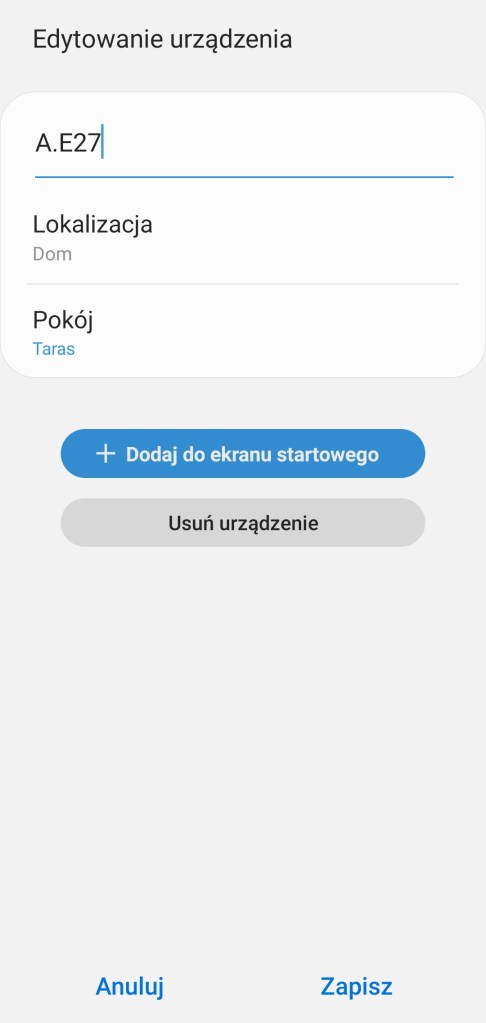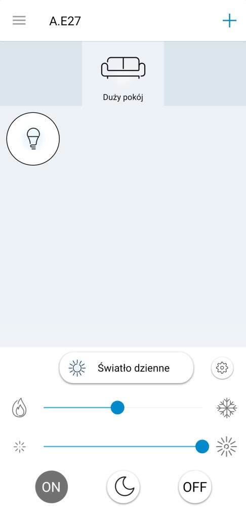Sposób użycia: Po wkręceniu żarówki i dodaniu do systemu, możemy nią sterować. Tutaj niestety pojawia się minus tego rozwiązania, nie można wyłączyć włącznika ściennego od danego żyrandola. Odłączając źródło prądu nie mamy już możliwości sterowania. Pozostaje nam pozostawienie włącznika świetlnego w ciągłej pozycji włączonej. Na szczęście mamy inne możliwości sterowania np. poprzez aplikację (ręcznie, automatyzacje czy sceny) oraz fizycznie poprzez np. przycisk czy pilot.