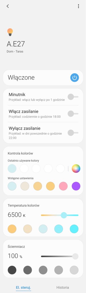 W głównym panelu aplikacji mamy możliwość włączenia/wyłączenia żarówki WiZ, zaprogramowania szybkich automatyzacji: włączenia i wyłączenia żarówki LED oraz pewną formę minutnika. Poniżej posiadamy możliwość ustawienia dowolnego koloru z palety barów RGB, jak i pięć ostatnio używanych barw oraz sześć sugestii. Kolejna belka pozwala na ustawienie temperatury światła w zakresie 2200 K – 6500 K. Ostatnia opcja to ustawienia ściemniacza od 1 do 100%. Pod ściemniaczem posiadamy również pięć kół, będących przyciskami ustawiającymi ściemniacz na kolejno od lewej 10%, 30%, 50%, 70% oraz 90% jasności. Panel „Historii” nie różni się znacznie od innych urządzeń, mamy dostęp do sortowania i przestudiowania historii działań żarówki. W ustawieniach „Edytuj” mamy standardową możliwość zmiany nazwy, lokalizacji, pokoju.