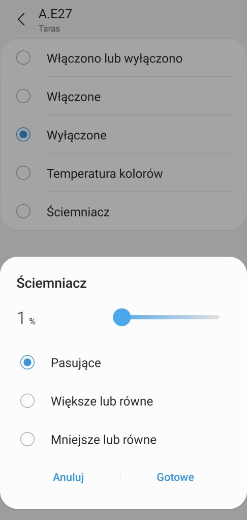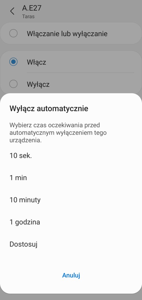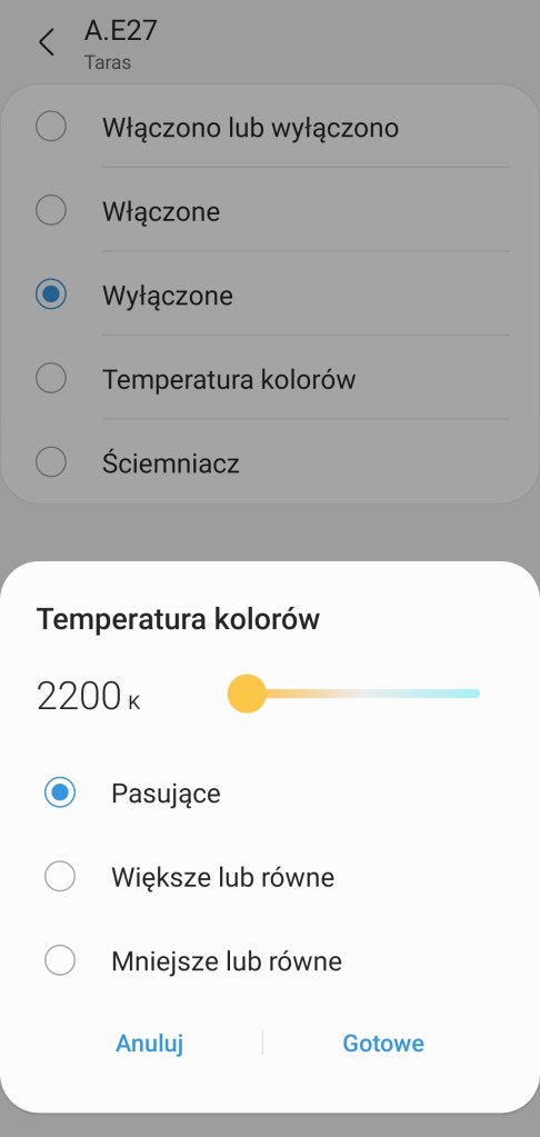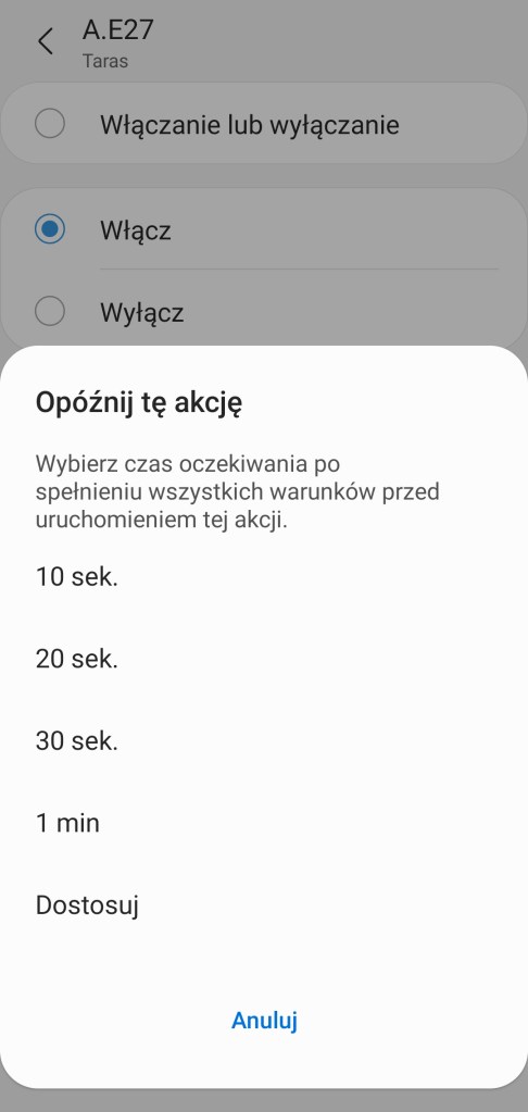 Tworzenie automatyzacji „Jeśli … to Wtedy” musimy podzielić na dwa etapy, ponieważ znacznie się różnią. W pierwszej możliwości „Jeśli” urządzenie pozwala na wybranie opcji „Włączono lub wyłączono” czyli zmiana stanu, oraz „Włączone” i „Wyłączone”, dodatkowo opcję jak długo ten stan musi się utrzymać, zanim uaktywni się automatyzacja. Poniżej wartość temperatury kolorów w zakresie 2200 K – 6500 K oraz wartość ściemniacza, w zakresie 1 – 100%. W drugiej możliwości „Wtedy”, listwa LED pozwala na ciut więcej, ponownie mamy opcje „Włączono lub wyłączono” czyli zmiana stanu, oraz „Włączone” i „Wyłączone”. Ustawienie konkretnego koloru z palety barw RGB oraz ustawienie jasności z zakresu 1 – 100%. Ostatnią opcją jest ustawienie temperatury koloru światła. Akcję uruchomienia możemy opóźnić o dowolny czas, jak i wyłączyć automatycznie po ustalonym czasie.