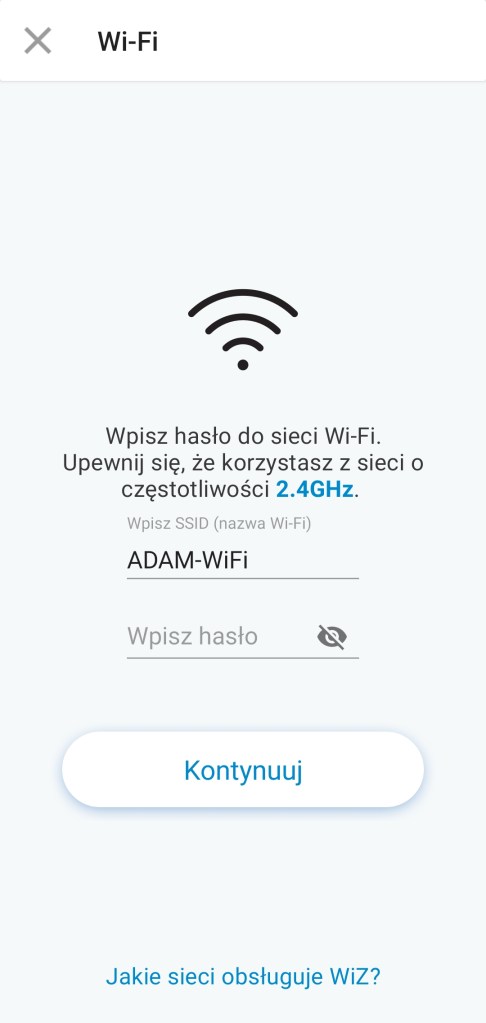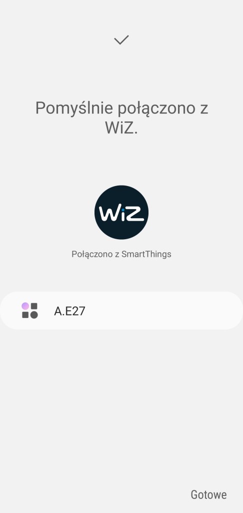 Na ekranie głównym aplikacji SmartThings, klikamy + „Dodaj”, następnie „Urządzenie”, wyszukujemy markę WiZ, dalej mamy dostępne tylko „Oświetlenie” klikamy, ponownie wybieramy producenta. Zostaniemy przeniesieni na stronę internetową WiZ, gdzie wpisujemy wcześniej skopiowany kod aktywacyjny, klikamy strzałkę. Zostaniemy poinformowani o zidentyfikowaniu i potwierdzamy połączenie z ekosystemem SmartThings, klikając „Kontynuuj”. Zostaniemy poinformowani o udanym połączeniu usług WiZ i SmartThings. Zamykamy iksem w lewym górnym rogu stronę internetową i po chwili pokaże nam się lista wszystkich urządzeń z aplikacji WiZ. Klikamy „Gotowe”, znalezione urządzenia pojawią się nam na dole w sekcji nieprzypisanych do żadnego pokoju urządzeń.