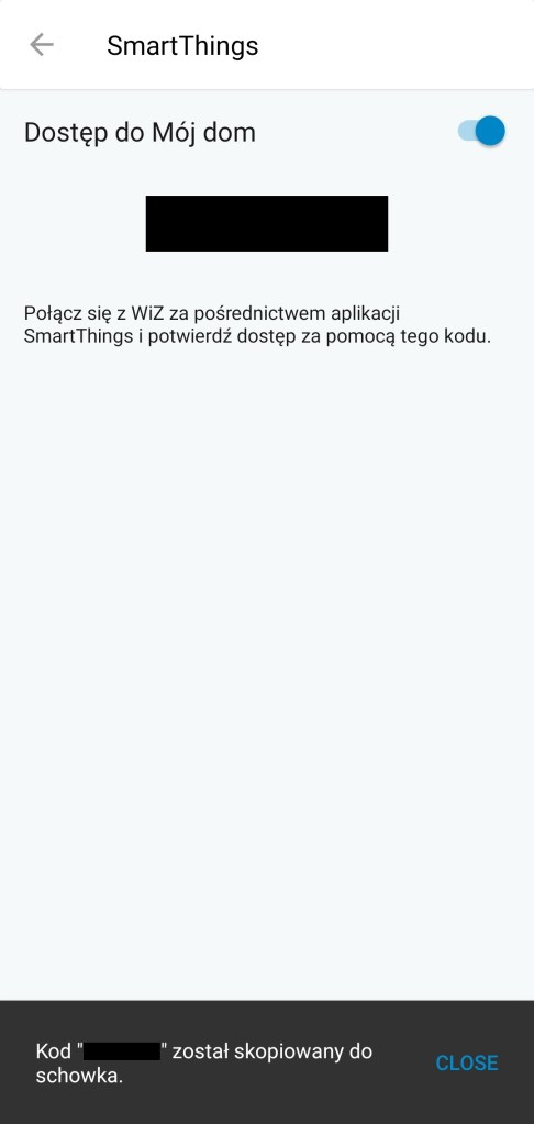Jeśli posiadamy już zainstalowane wszystkie żarówki i wtyczki. Możemy przejść do uzyskania kodu aktywacji, który posłuży do połączenia usług. W tym celu należy otworzyć menu paska bocznego, a następnie „Ustawienia”. Przewiń w dół aby przejść do sekcji „Integracje”, a następnie kliknij „SmartThings” i włącz ją za pomocą przycisku przełączania, pojawi się wtedy kod. Jest ważny przez 5 minut i jest kluczem do połączenia Twojego domu WiZ z ekosystemem SmartThings. Skopiuj ten kod do schowka, a następnie przejdź do aplikacji SmartThings.