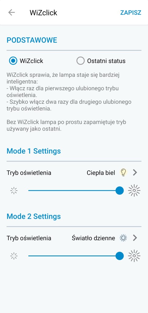 W ustawieniach żarówki WiZ, w aplikacji producenta, znajdziemy ciekawą opcję o nazwie „WiZclick”. Dzięki niej posiadamy możliwość ustawienia co się stanie po zapaleniu włącznika ściennego. Posiadamy dwie opcje dla pierwszego włączenia zasilania oraz dla dwukrotnego szybkiego przełączenia włącznika ściennego. Dla każdej z opcji możemy ustawić swój ulubiony kolor. Dodatkowo możemy zrezygnować z tej opcji i żarówka po prostu zapamięta ostatni używany kolor.
