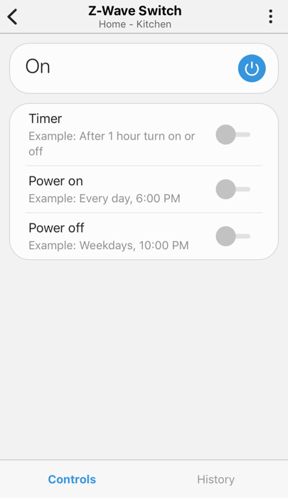 Kliknięcie karty powoduje wyświetlenie strony urządzenia z dodatkowymi elementami sterującymi. Strona urządzenia zawiera przycisk do włączania i wyłączania przełącznika, a także interfejsy do planowania zdarzeń włączania/wyłączania w przyszłości. Te zdarzenia są wykonywane przez platformę SmartThings w odpowiednim czasie, powodując, że koncentrator wysyła polecenia do urządzenia.