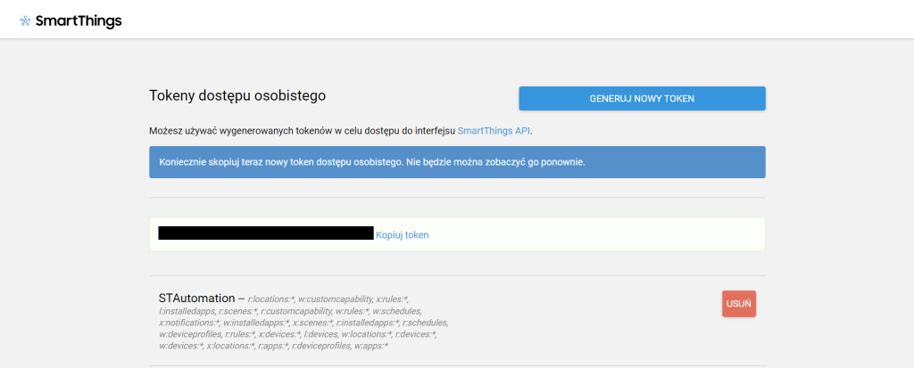 Aby wygenerować osobisty token dostępu, należy zalogować się na swoje konto SmartThings lub Samsung pod linkiem: account.smartthings.com/tokens.