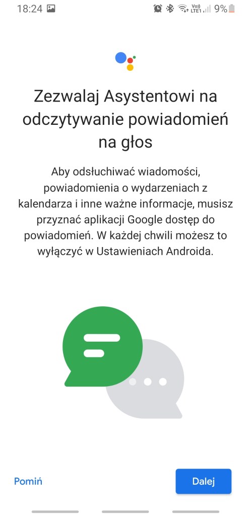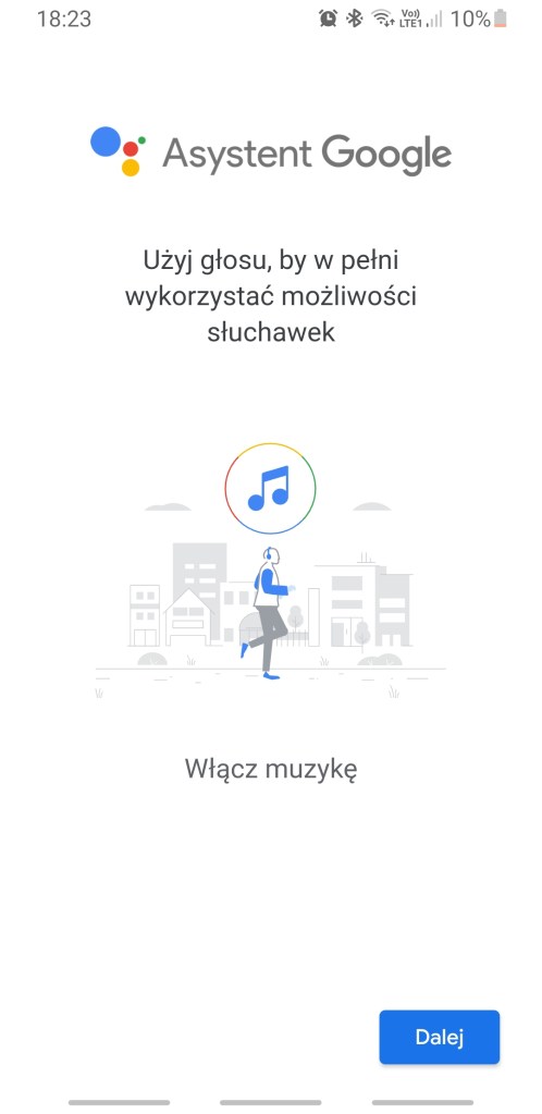 Po podłączeniu słuchawek asystent automatycznie wyświetli poniższe powiadomienie. Klikamy kolejno „Dalej” zgadzając się na odczytywanie powiadomień i nasłuchiwanie.