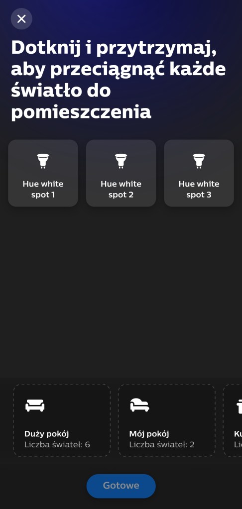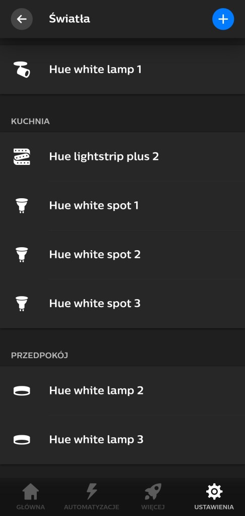 Jeśli posiadamy mostek Hue i centralę SmartThings możemy przejść do tradycyjnej instalacji. W pierwszej kolejności musimy połączyć nowe żarówki z mostkiem i aplikacją Philips Hue. W tym celu musimy pobrać aplikację z Google Store bądź AppStore (iOS 12.0 lub nowszy). Po zainstalowaniu aplikacji, uruchamiamy ją. Aby wyszukać nowe urządzenia, musimy przejść do Ustawienia aplikacji, klikamy w prawym dolny róg ekranu. Z dostępnych opcji, kliknij Światła, następnie plus ( + ) znajdujący się w prawym górnym rogu. Należy upewnić się, że żarówki podłączone są do zasilania. Możemy je dodać poprzez wpisanie numeru seryjnego (znajduje się on na urządzeniu) lub poprzez wyszukanie. Wybraliśmy pierwszą opcję, klikamy Użyj numeru seryjnego, wpisujemy kod i stukamy Wyszukaj. Po chwili zostaną wykryte, nadajemy każdej z nich nazwę i zatwierdzamy klikając Zapisz. Następnie umieszczamy je w pokojach, w tym celu przeciągnij je do wybranego pokoju, kliknij Gotowe.