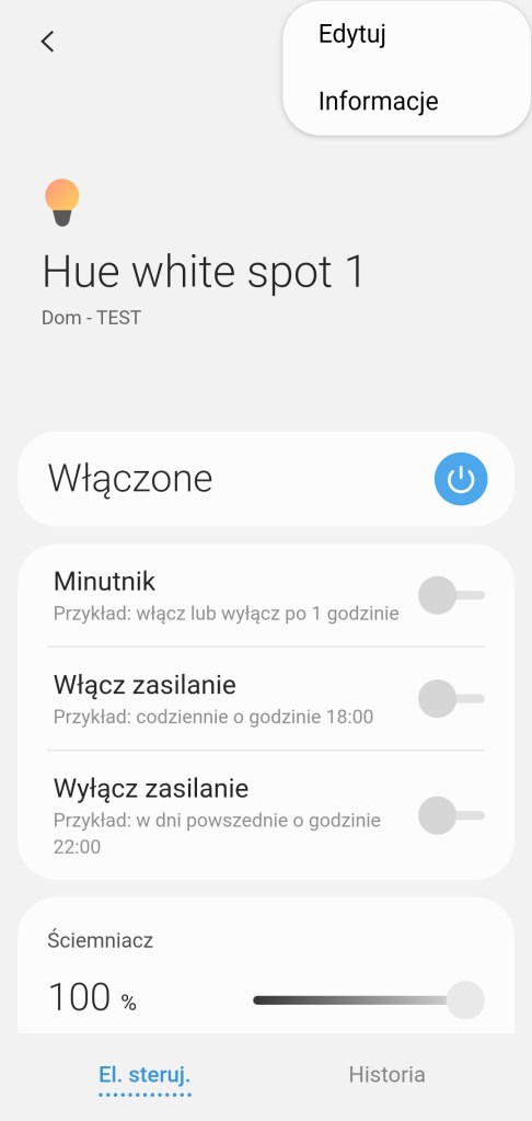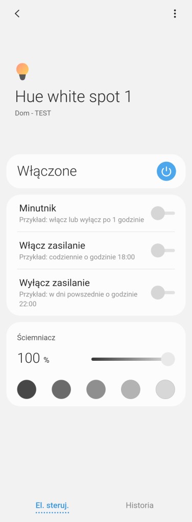 W głównym panelu aplikacji mamy możliwość włączenia/wyłączenia żarówki Philips Hue, zaprogramowania szybkich automatyzacji: włączenia i wyłączenia reflektora LED oraz pewną formę minutnika. Poniżej posiadamy opcję ustawienia ściemniacza od 1 do 100%. Pod ściemniaczem posiadamy również pięć kół, będących przyciskami sterującymi ściemniaczem na kolejno od lewej 10%, 30%, 50%, 70% oraz 90% jasności. Panel „Historii” nie różni się znacznie od innych urządzeń, mamy dostęp do sortowania i przestudiowania historii działań żarówki. W ustawieniach „Edytuj” mamy standardową możliwość zmiany nazwy, lokalizacji, pokoju oraz możliwość dodania do panelu „Ulubione”.